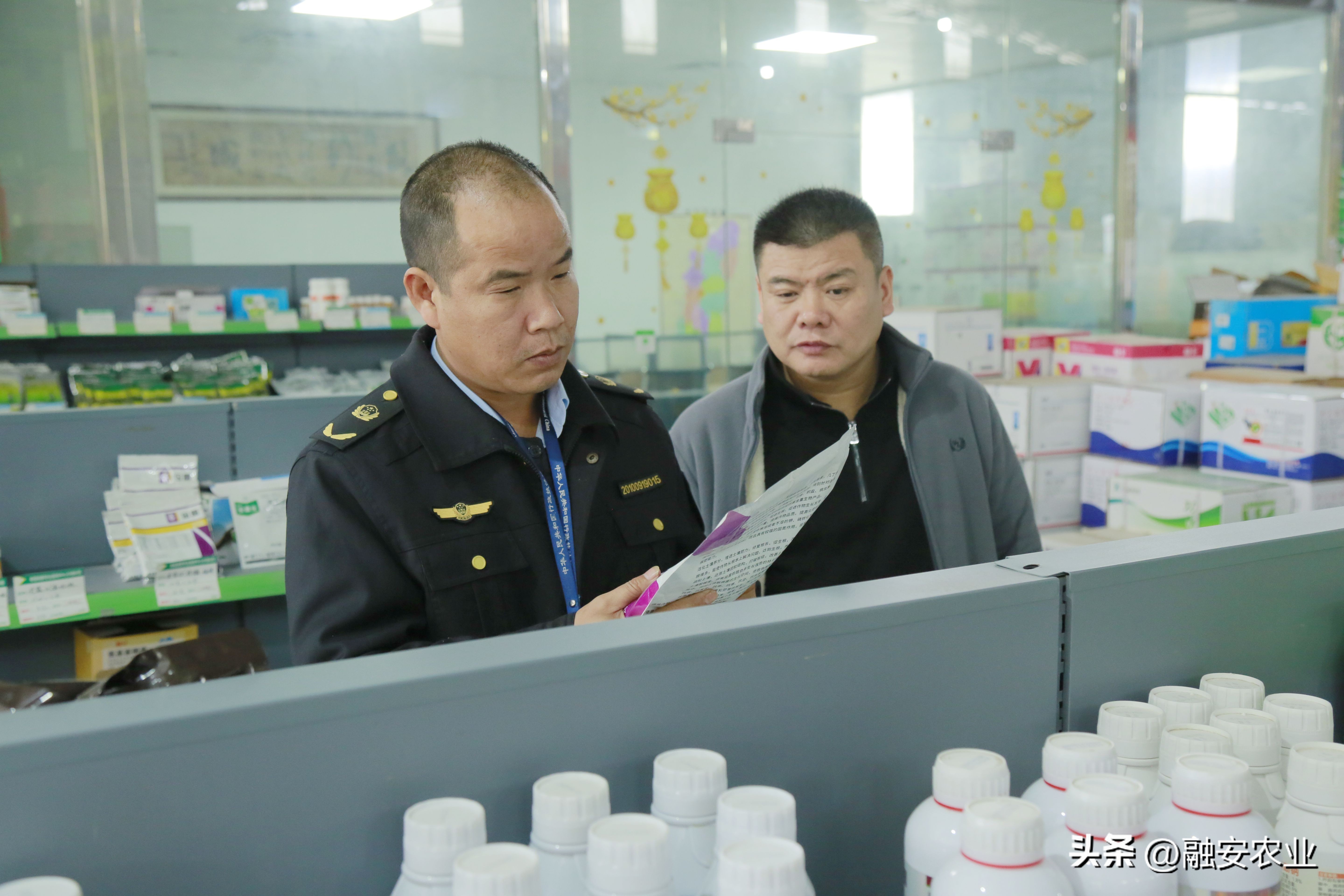 执法人员在检查农资店废弃农药瓶、肥料袋回收情况
