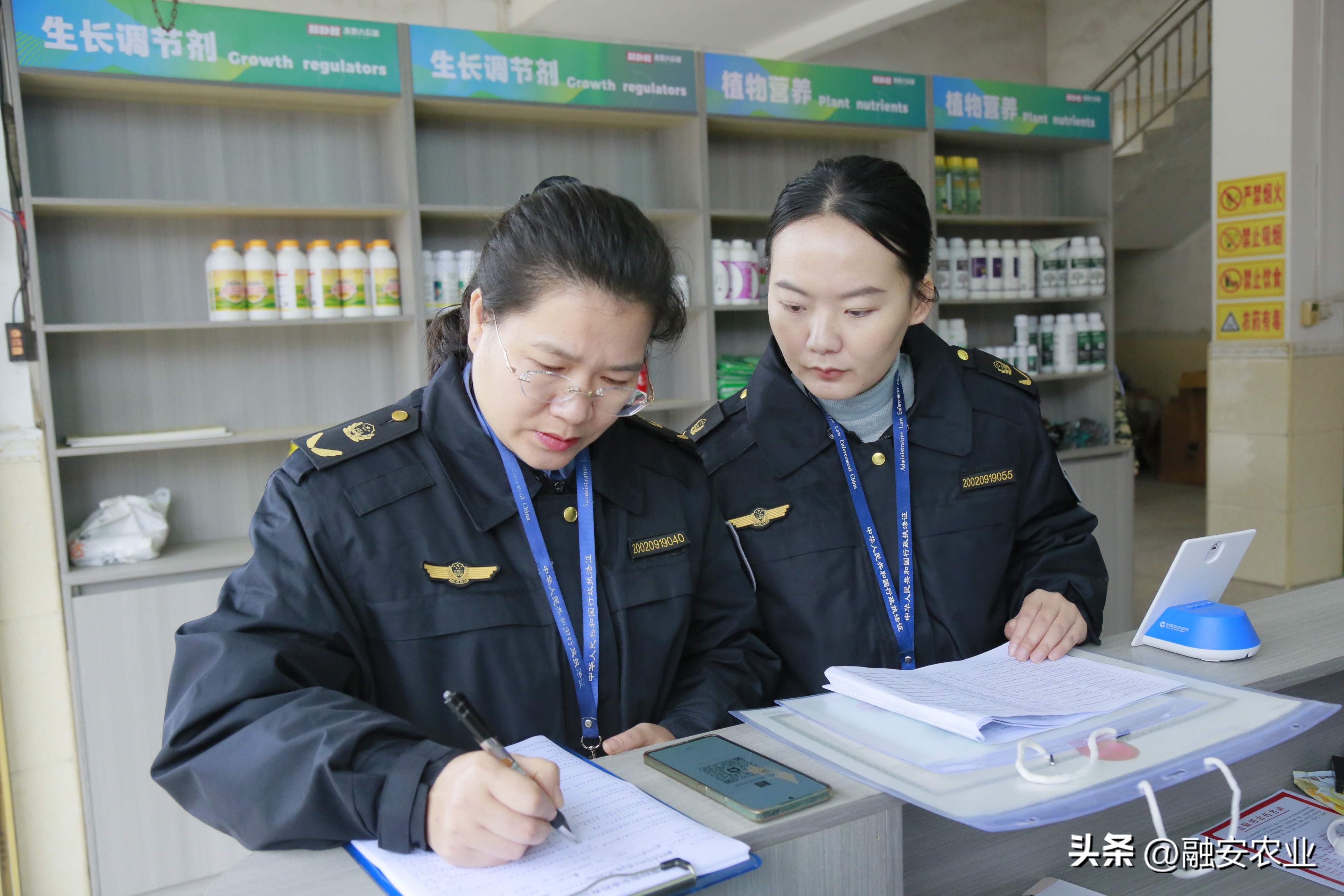 执法人员对农资店检查情况进行登记确认