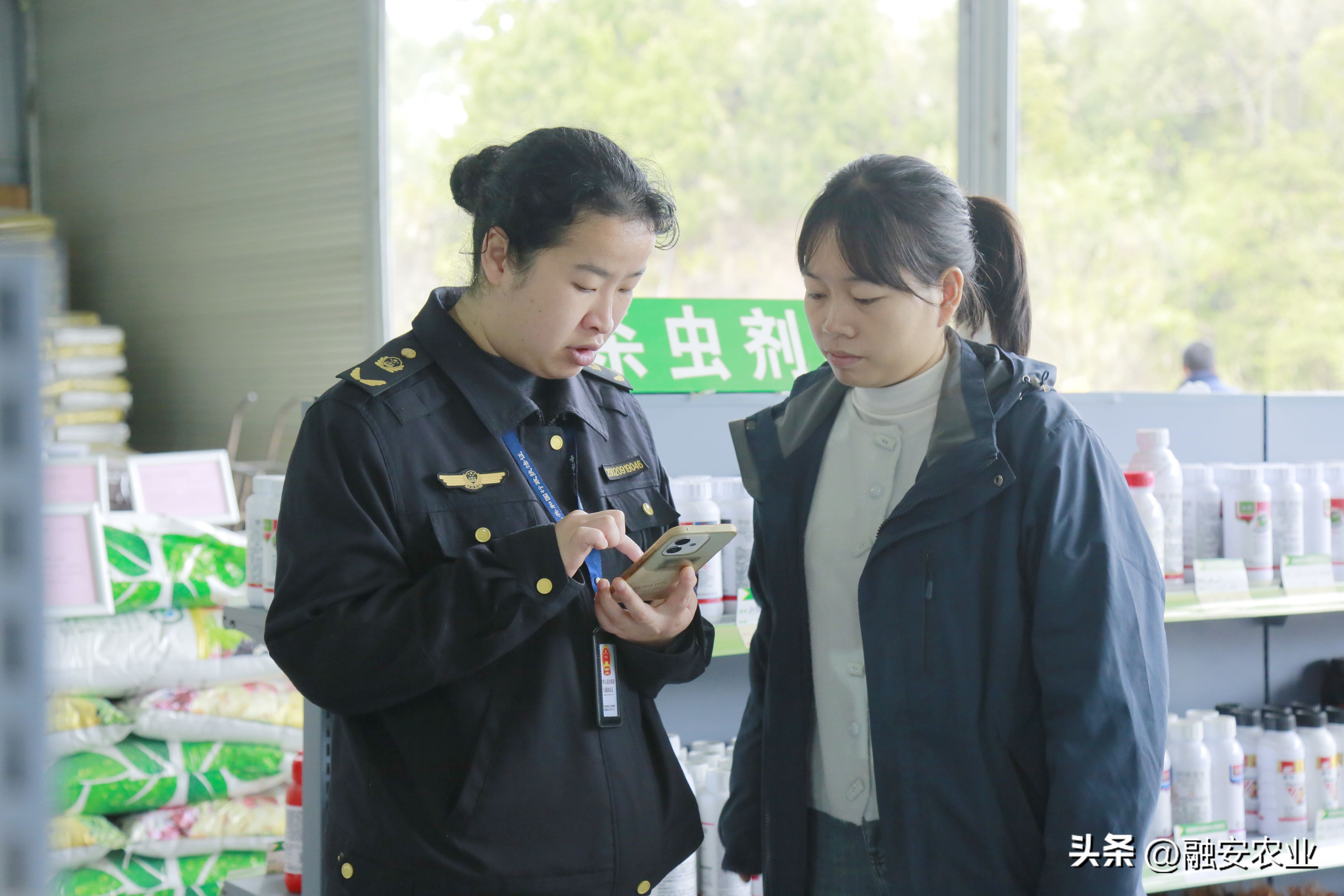 执法人员在指导农资店经营者利用手机APP查询农药登记备案情况