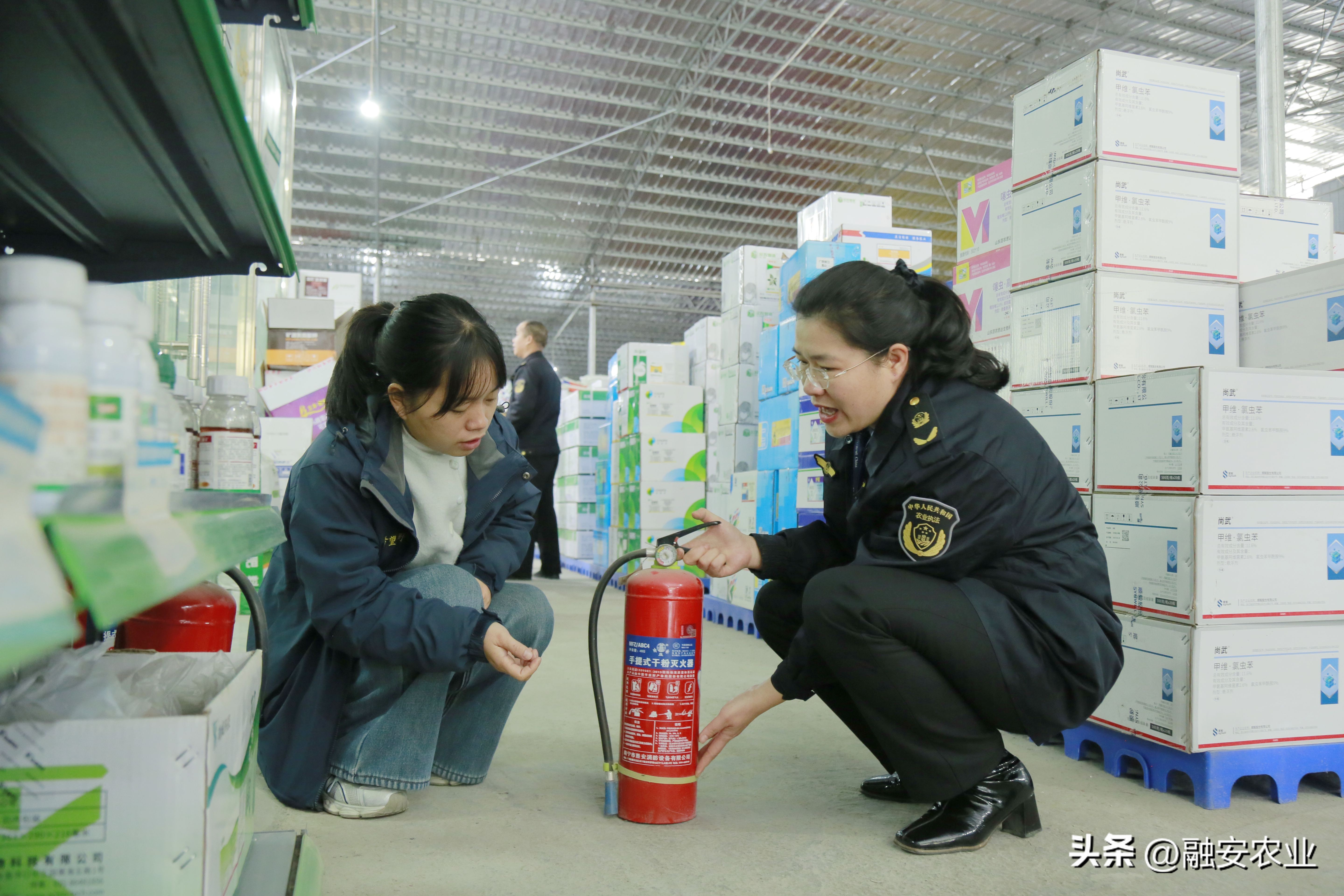 执法人员在检查农资店灭火器等生产安全设施配备情况