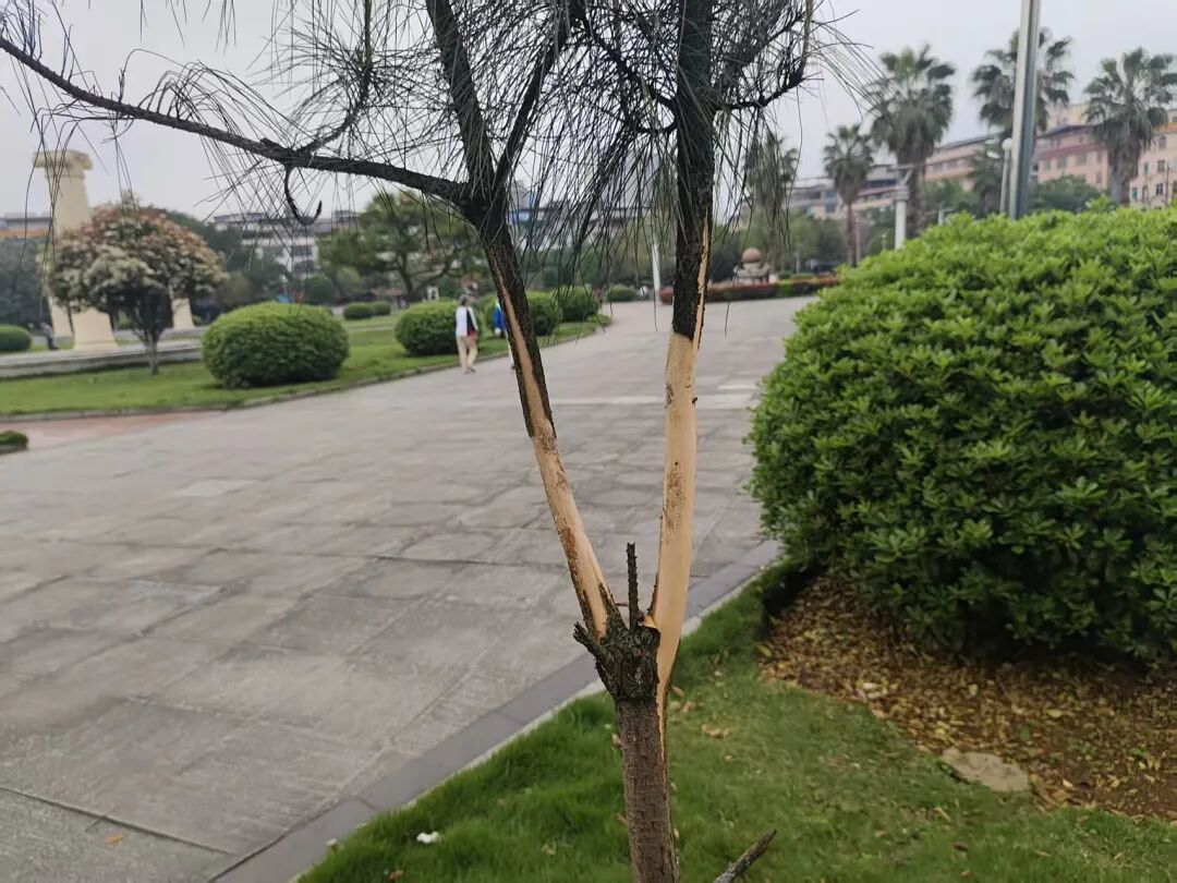 经现场核查,该树树干分叉处约40厘米长的树皮被剥去,损伤严重,如不及时救治,将面临枯死风险。由于事发区域无公共监控,暂时无法锁定责任人,执法人员当即联系园林站,对松树进行专业修复包扎,并将持续跟踪养护,全力挽救绿色生命。