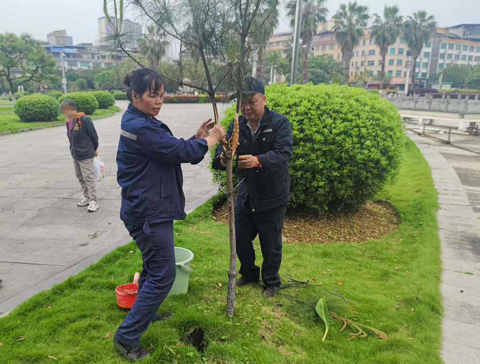 园林站工作人员正在修复长安广场内遭人为剥皮的小树