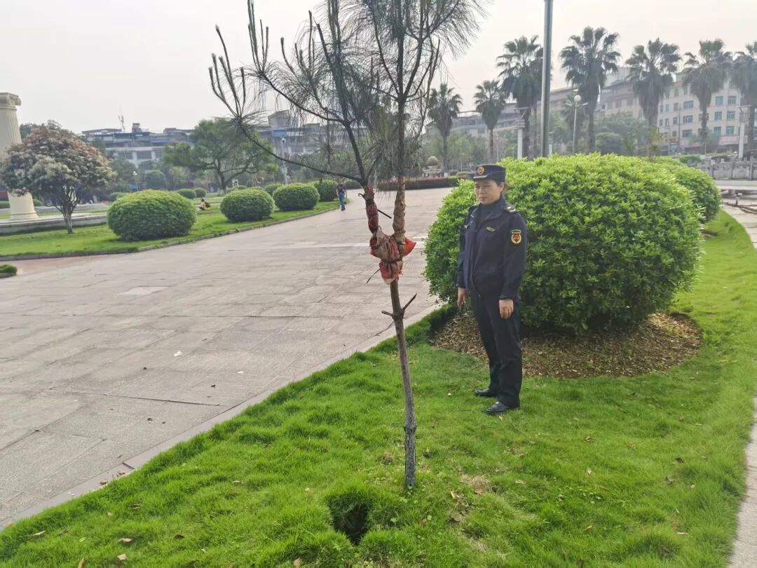 执法人员在长安广场开展日常巡查时发现一棵小树遭人为剥皮