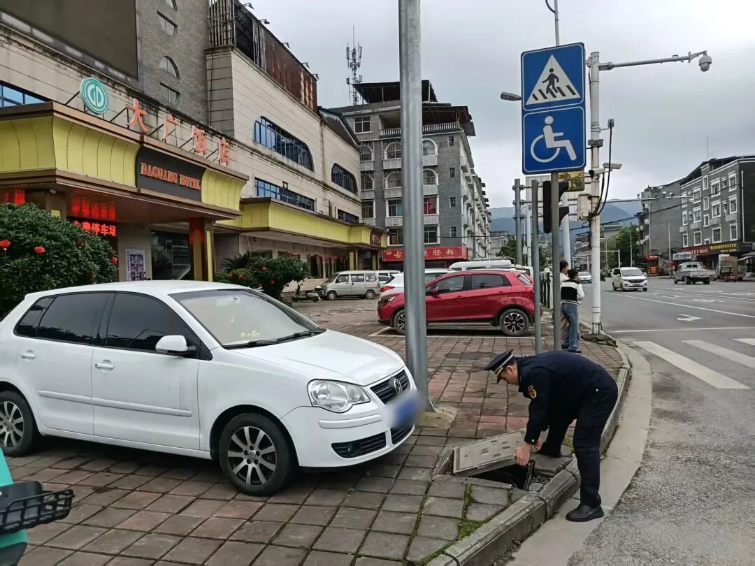 融安县信息中心巡查员现场动手对移位井盖进行复位