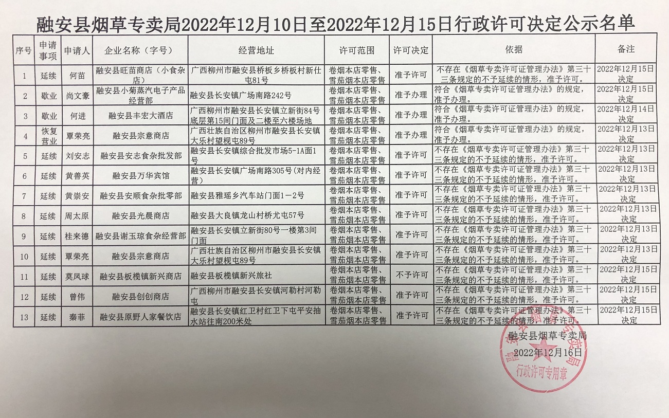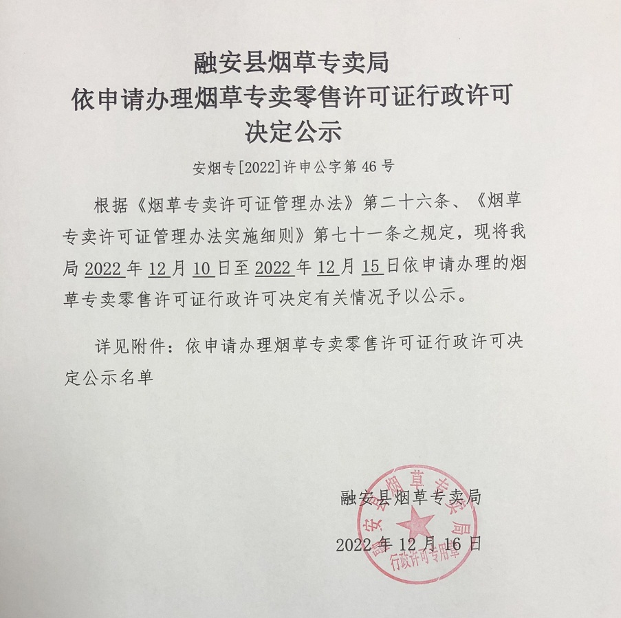 融安县烟草专卖局依申请办理烟草专卖零售许可证行政许可决定公示(安烟专[ 2022 ] 许申公字第46号)