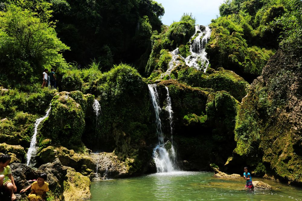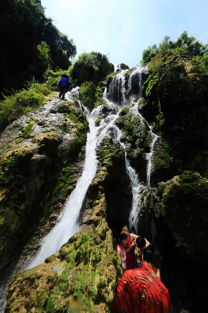 图9:7月20日,游客在融安县泗顶镇山贝村清潭瀑布游玩。