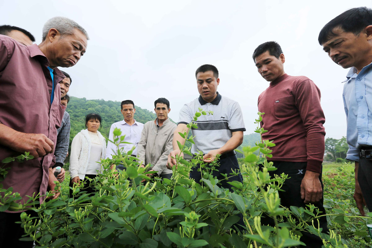 图1:5月9日,融安县泗顶镇马田村,一名科技人员向群众讲解金银花种植技术。