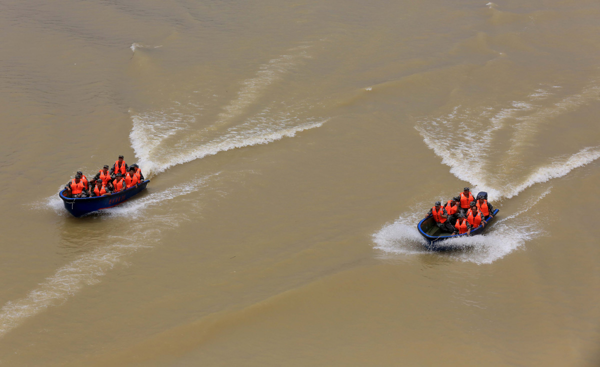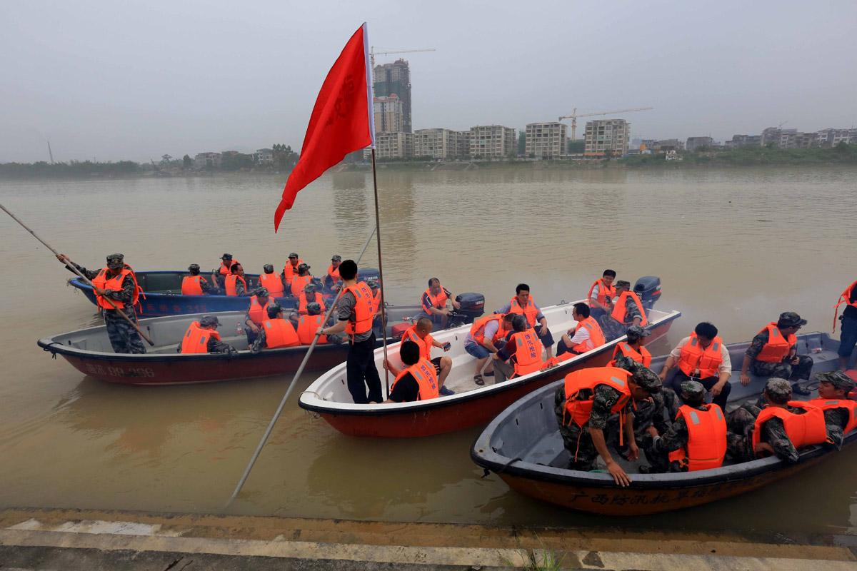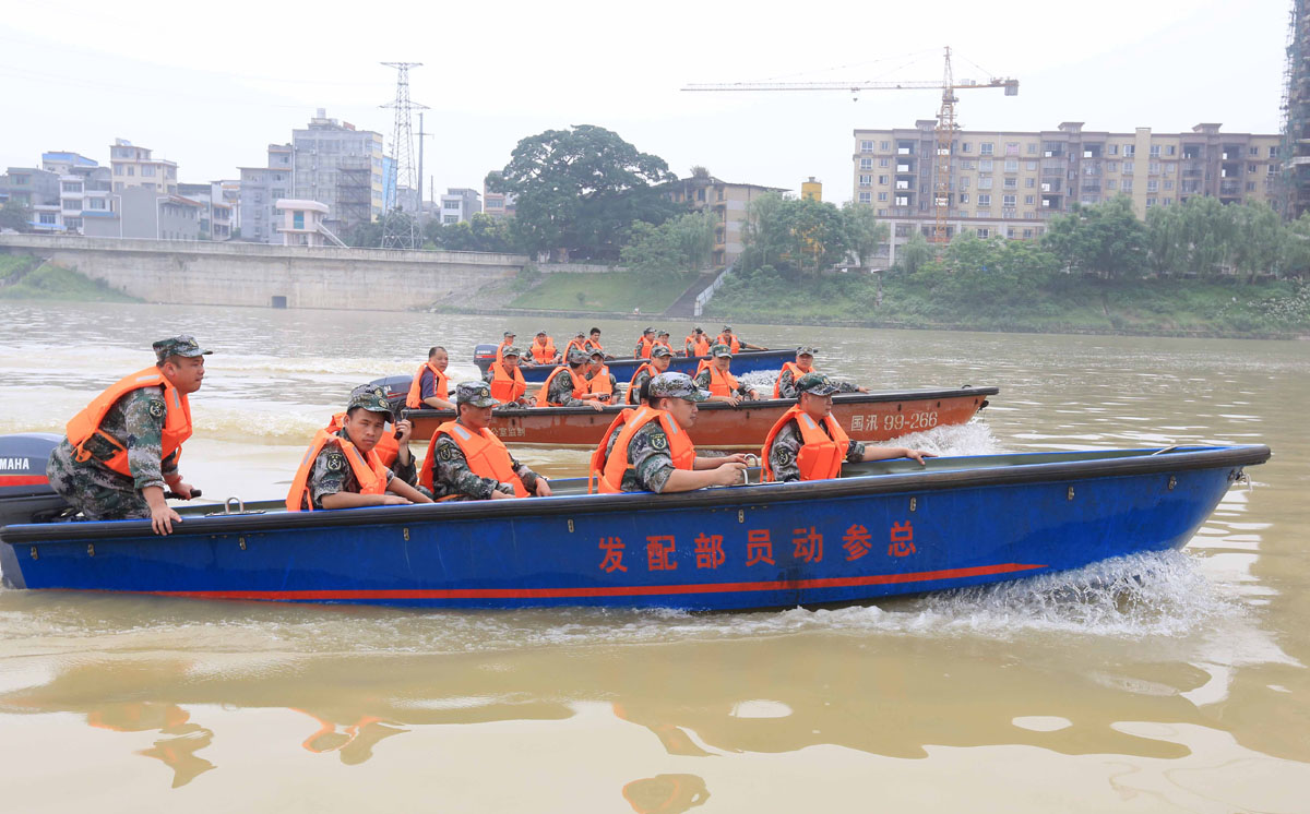 图1:5月30日,在融江广西柳州市融安县城段江面上,民兵应急分队在进行防汛抗洪抢险演练。