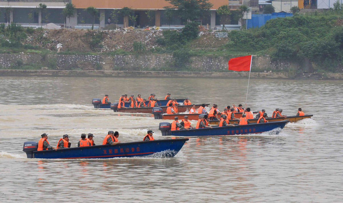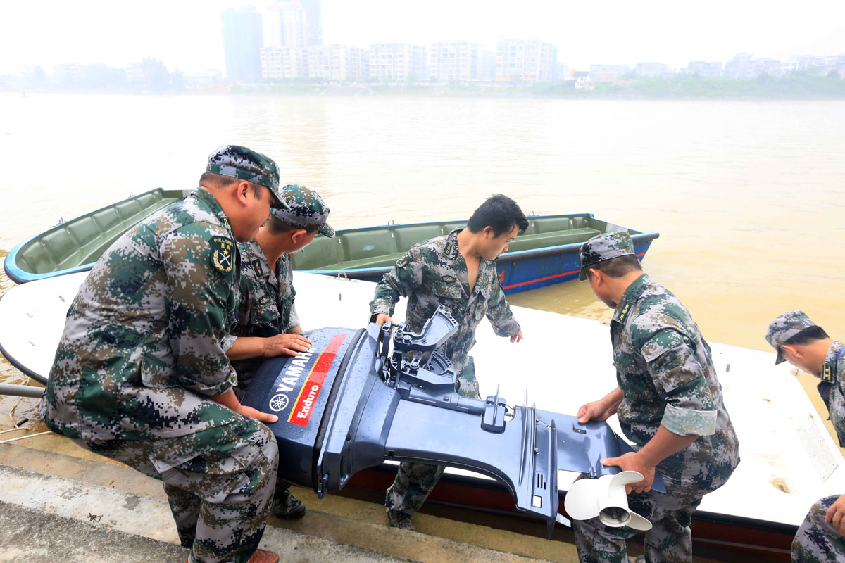 图4:5月30日,在融江广西柳州市融安县城段,民兵应急分队在进行冲锋舟编队训练。