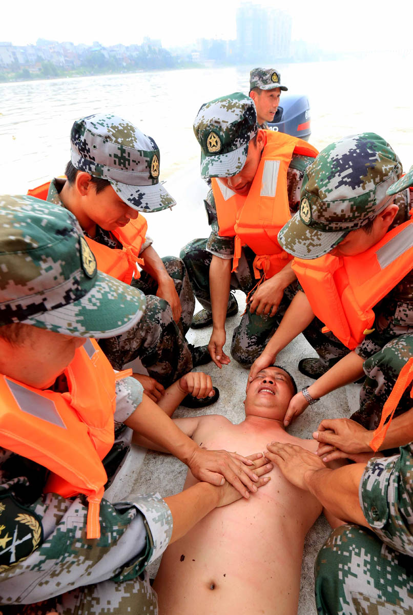 图7:5月30日,民兵应急分队在演练中对溺水人员进行抢救。