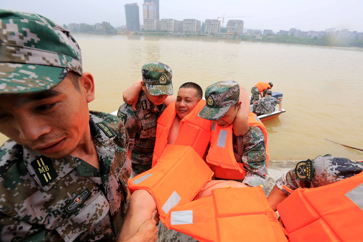 图6:5月30日,在融江广西柳州市融安县城段江面上,民兵应急分队在进行溺水救援演练。