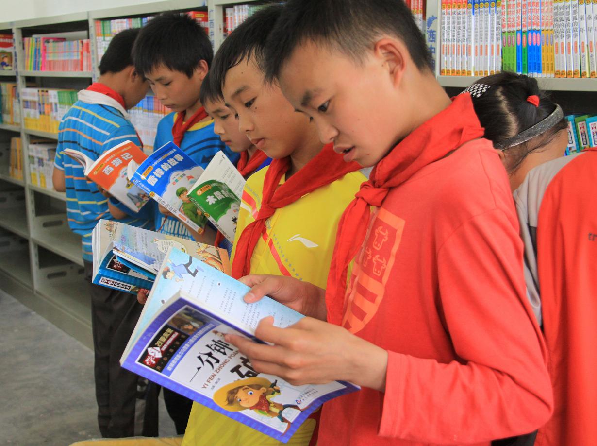 图为:5月28日,在融安县浮石镇木瓜村小学的真龙爱心阅览室,一群小学生正在阅读图书。