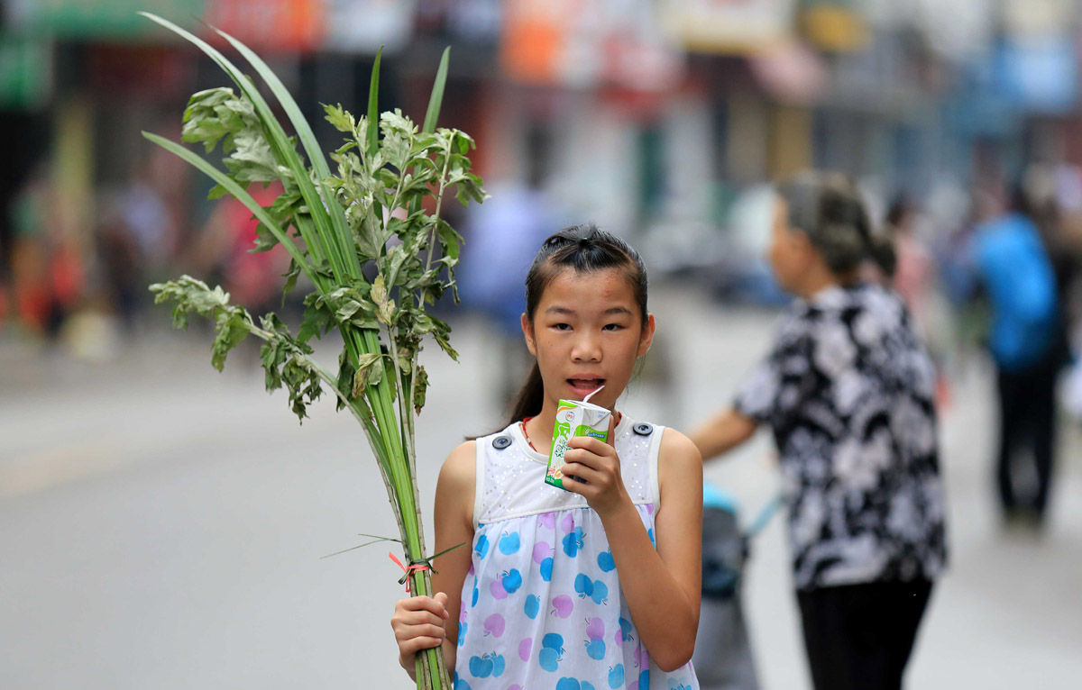 图1:6月2日,在融安县长安镇立新街,一名女孩购买艾草、菖蒲等中草药回家。