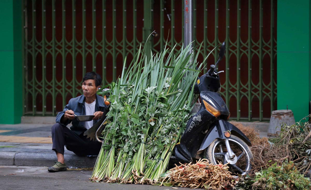 图2:6月2日,在融安县长安镇立新街,一名群众在销售艾草、菖蒲等中草药。