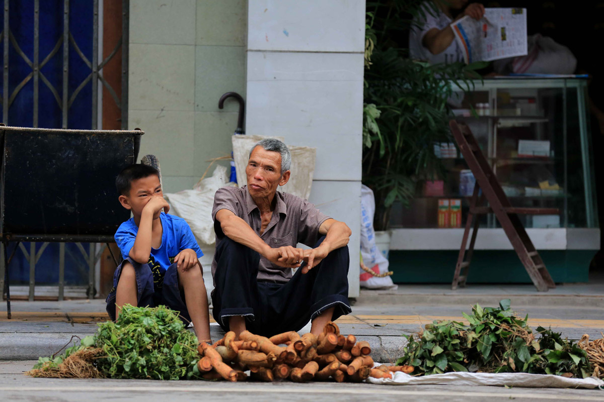 图3:6月2日,在融安县长安镇立新街,一名学生陪家人销售艾草、菖蒲等中草药。