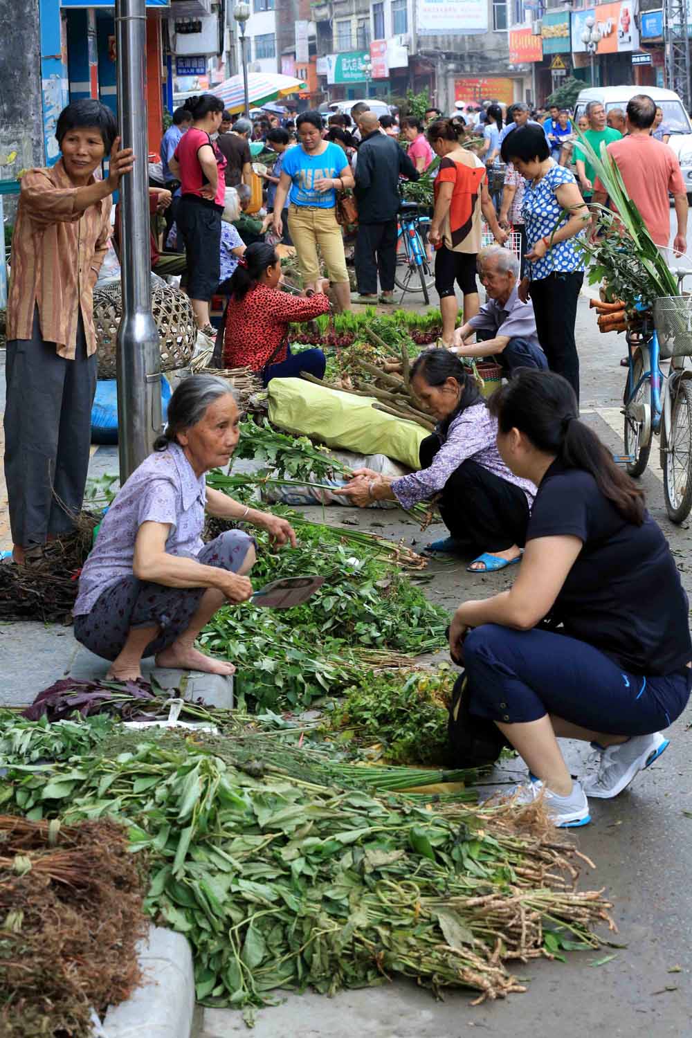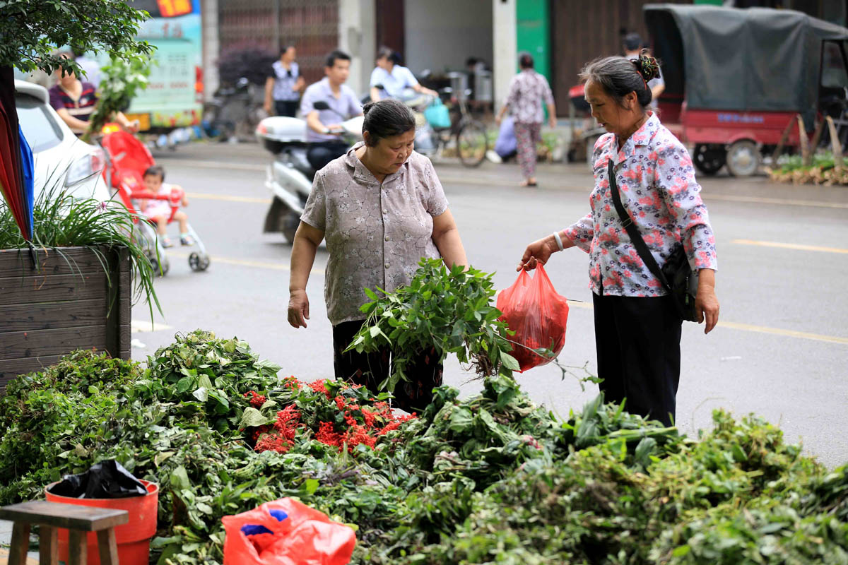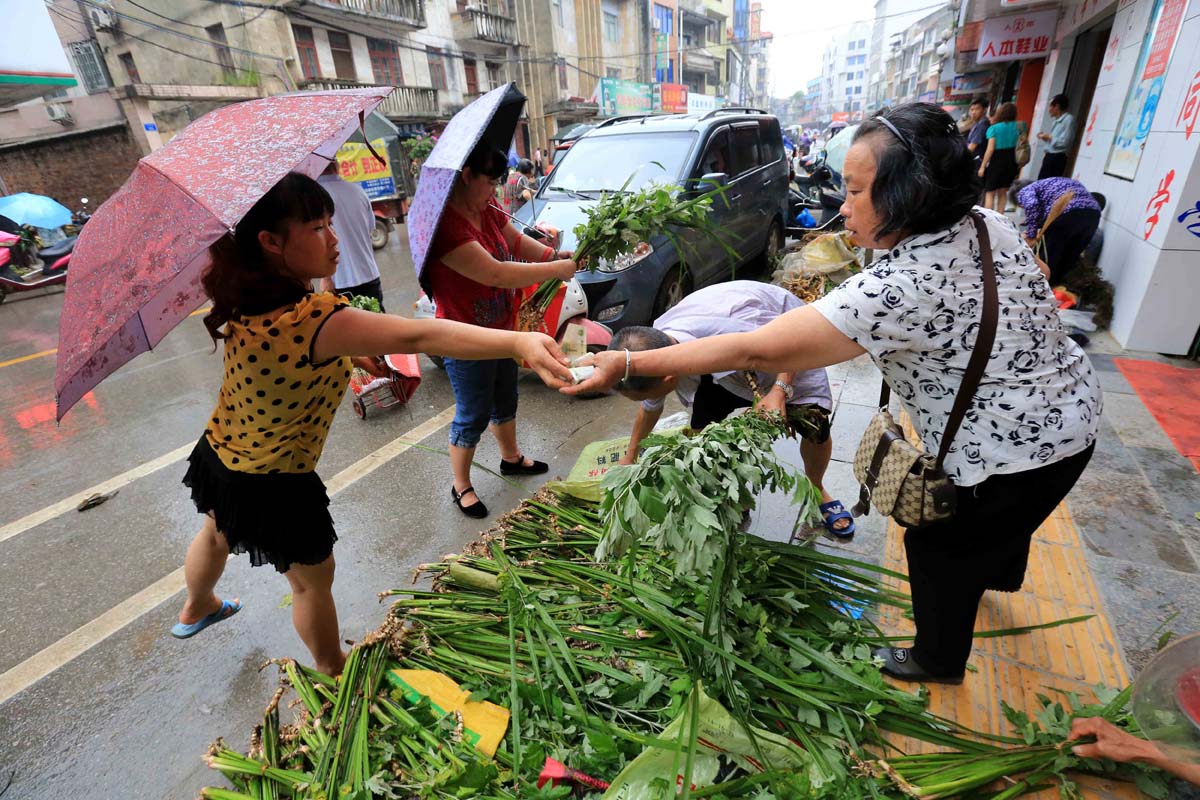 图4:6月2日,居民在融安县长安镇立新街购买艾草、菖蒲等中草药。