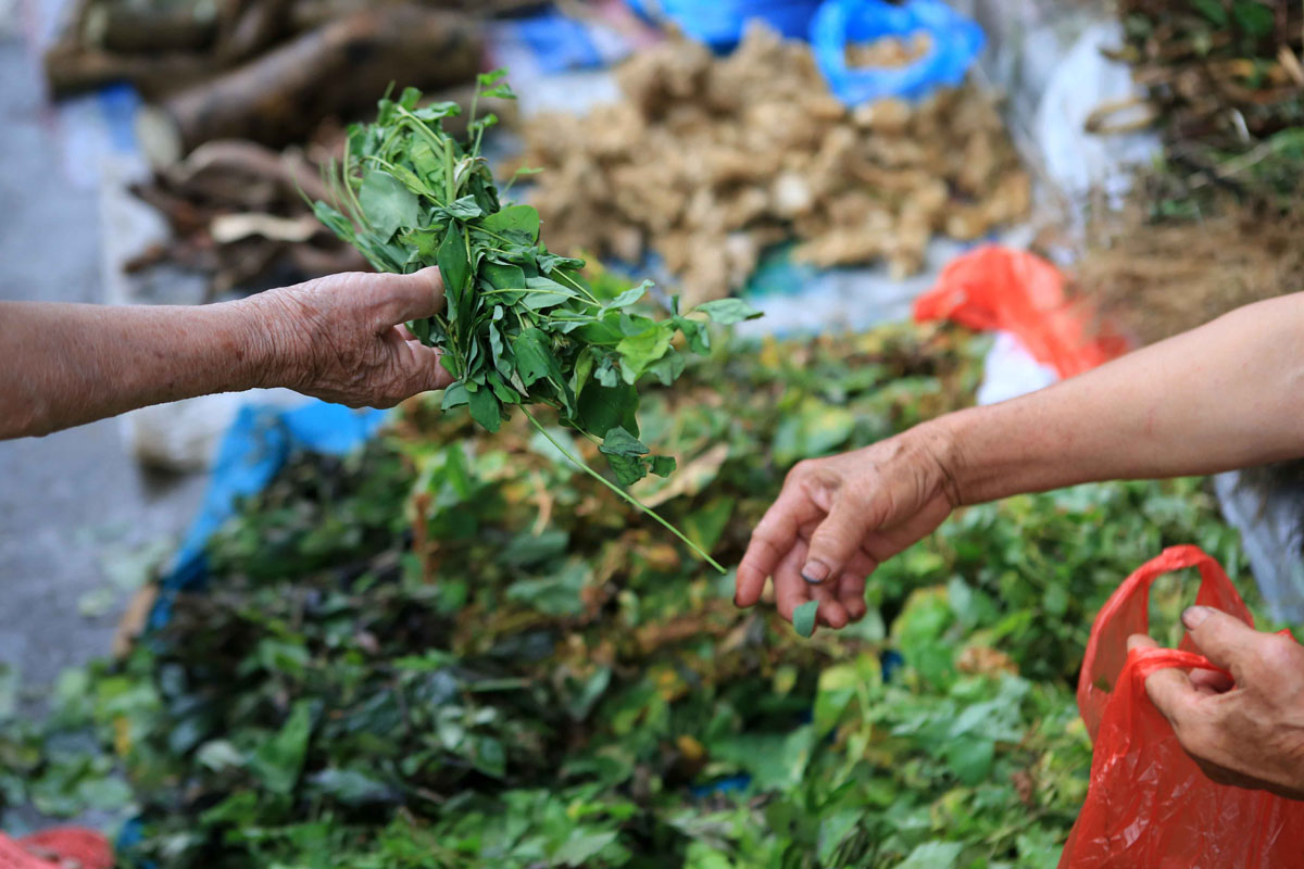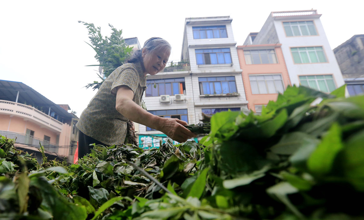 图10:6月2日,一名群众在融安县长安镇立新街挑选艾草、菖蒲等中草药。