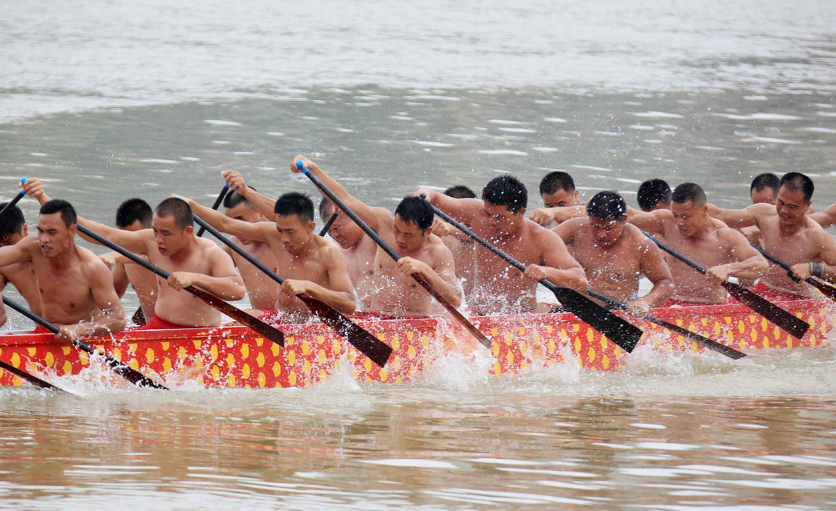 图1:5月26日,一支龙舟队在融江广西柳州市融安县段江面上训练。
