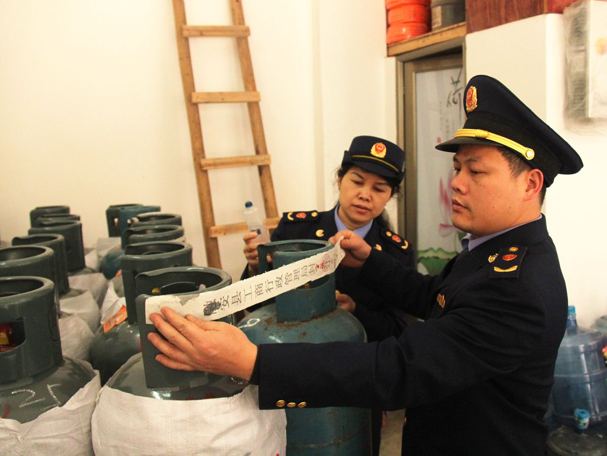 图1:3月22日,融安县工商行政管理局的执法人员对不合格的液化气罐进行查封。