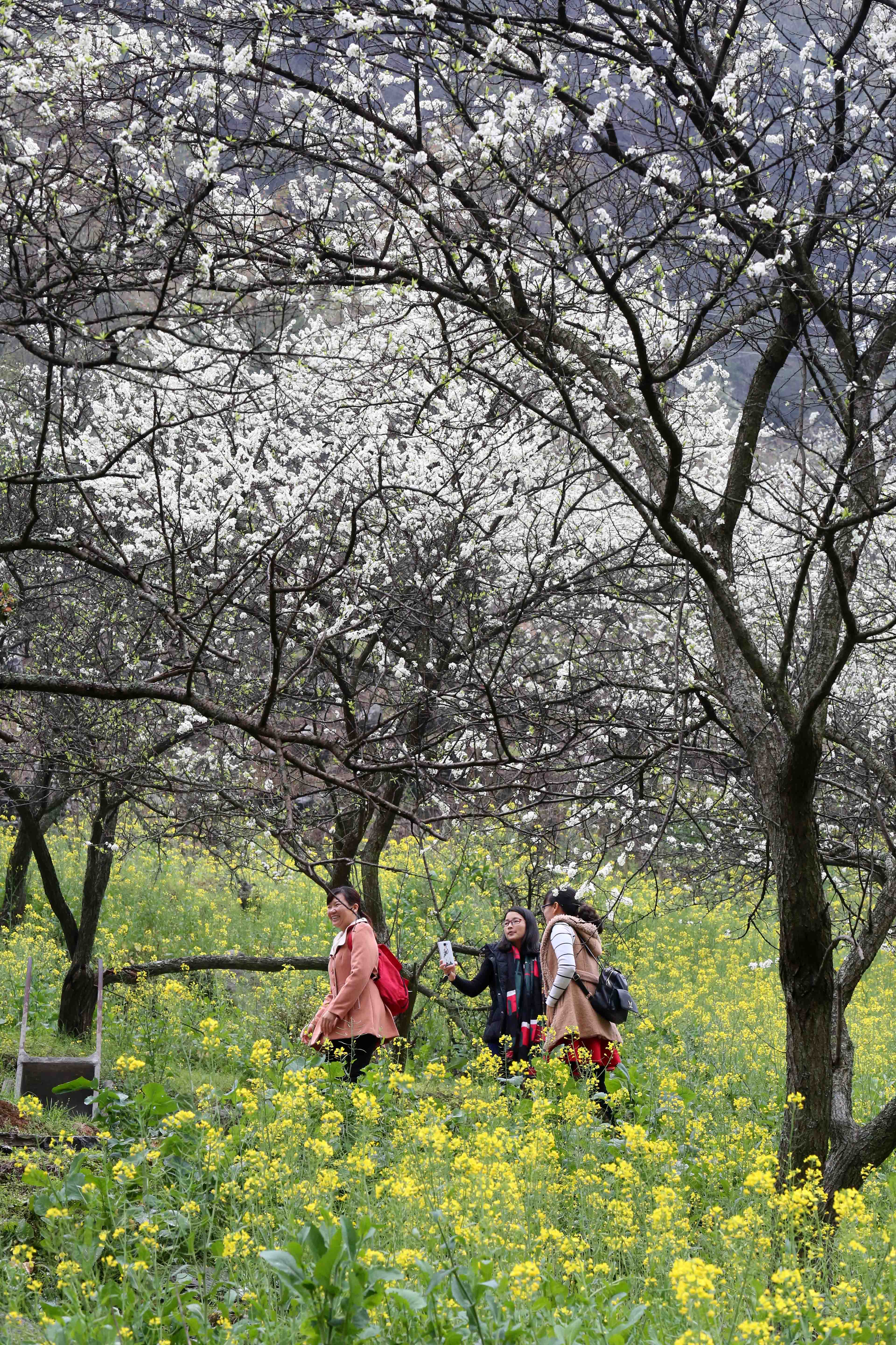 3月4日,拍摄的淹没在李子花海中的融安县东起乡铜板屯美景。阳春三月,融安县东起乡铜板屯500余亩李子花、油菜花渐次开放,整个村屯淹没花海中,宛如一派世外桃源的景象,吸引了众多游人前来踏青赏花。