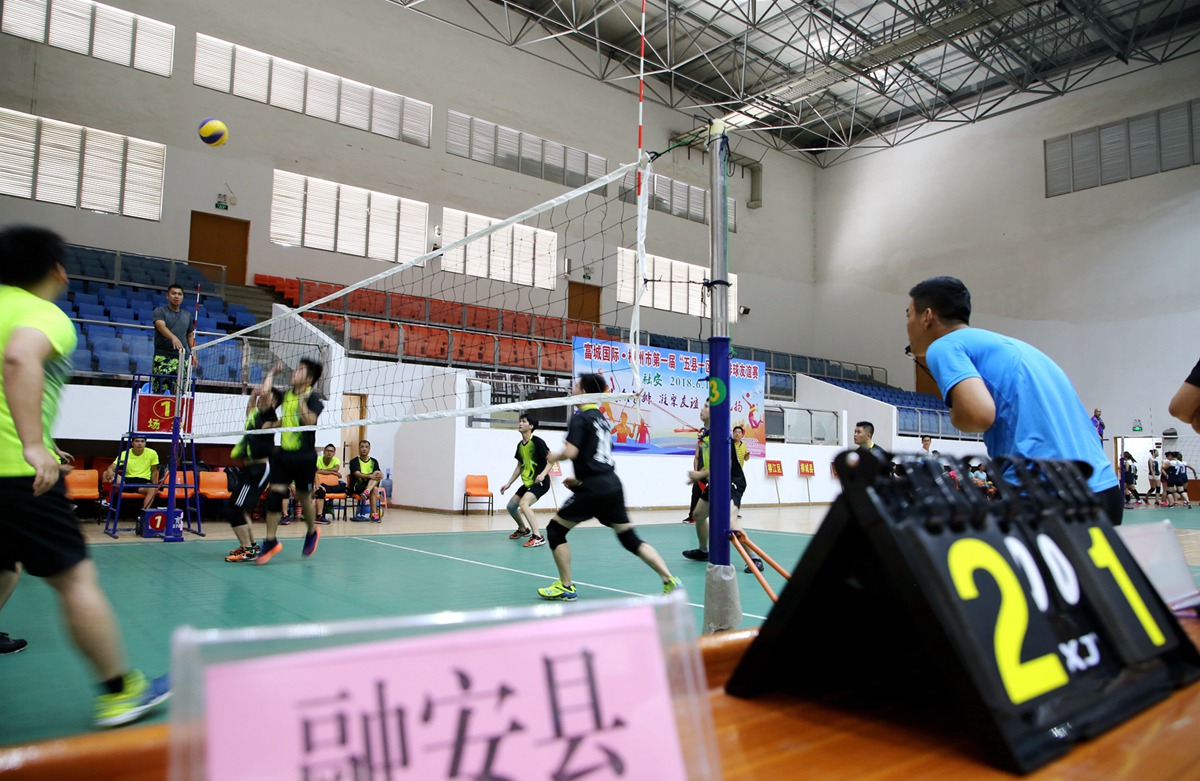 图1:6月16日上午,在融安县文体中心,富城国际.柳州市第一届“五县一区”气排球友谊赛正在打响。(韦荣军 摄)