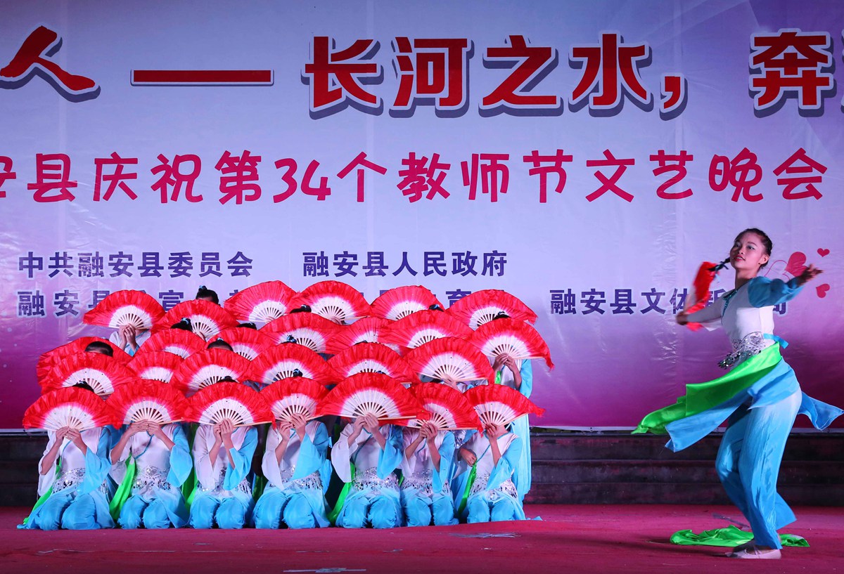 9月8日晚,在第34个教师节来临之际,融安县举行“百年育人——长河之水,奔流不息!”为主题的庆祝晚会。老师和学生们载歌载舞,诉说着融安县近年来教育事业的发展与取得的成绩。晚会上表彰了市级优秀教师、优秀教育工作者等,展现了教师队伍的良好精神风貌。
