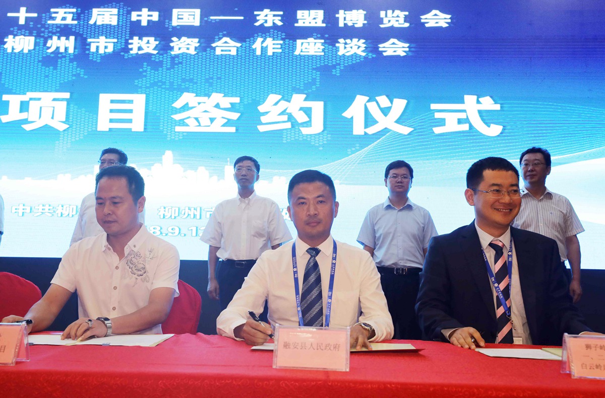 图1:9月12日,在2018中国—东盟柳州市投资合作座谈会上拍摄的融安项目签约仪式现场。(谭凯兴 摄)