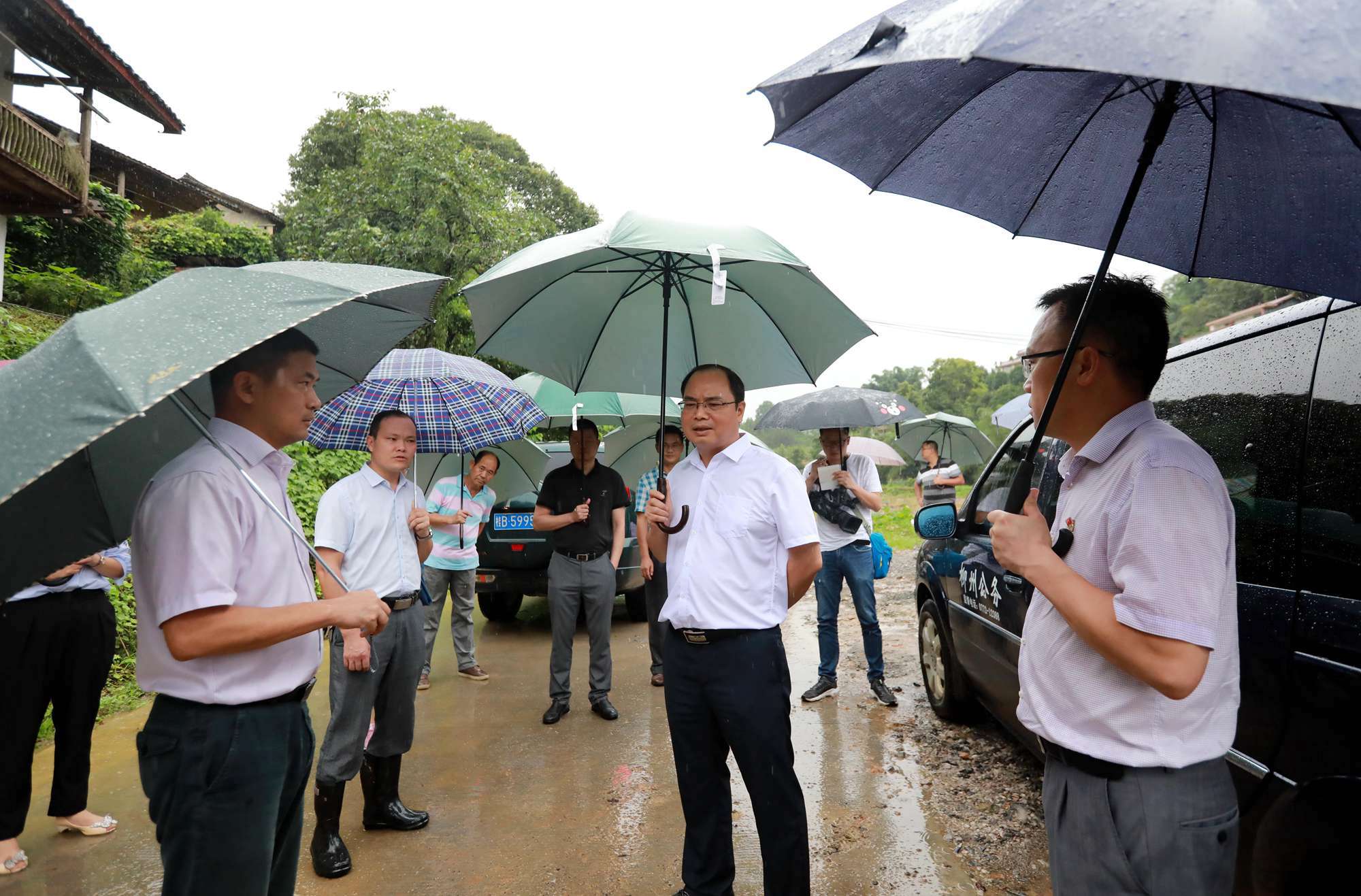 图1:7月13日,在融安县板榄镇官昔村,自治区自然资源厅副厅长郑杰忠(中)在了解当地因暴雨受灾情况。(覃庆和 摄)