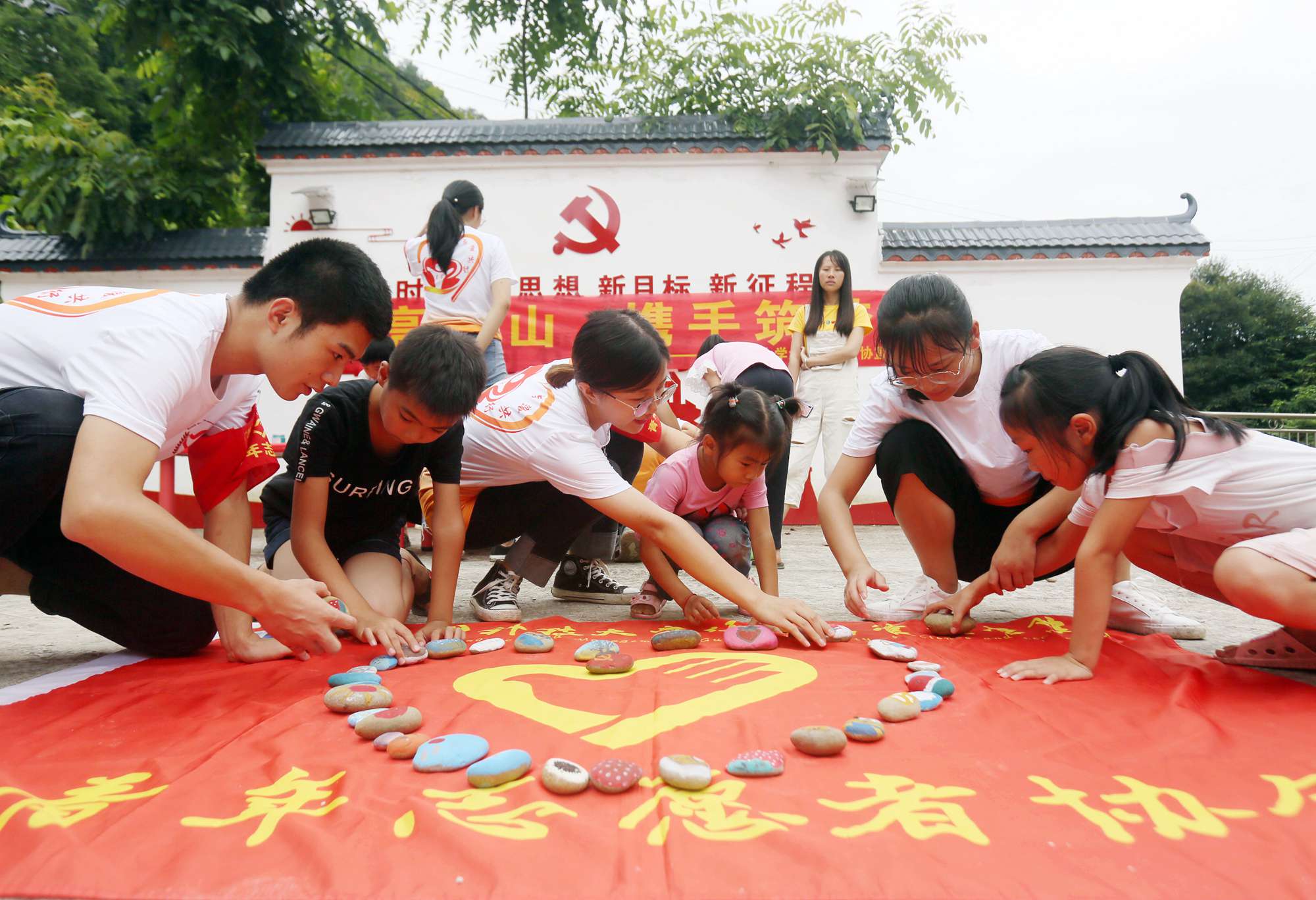 图一: 7月10日,在融安县泗顶镇寿局村村委,广西科技大学”三下乡”学生正在与孩子们拼石头彩绘画图。(韦荣军 摄)