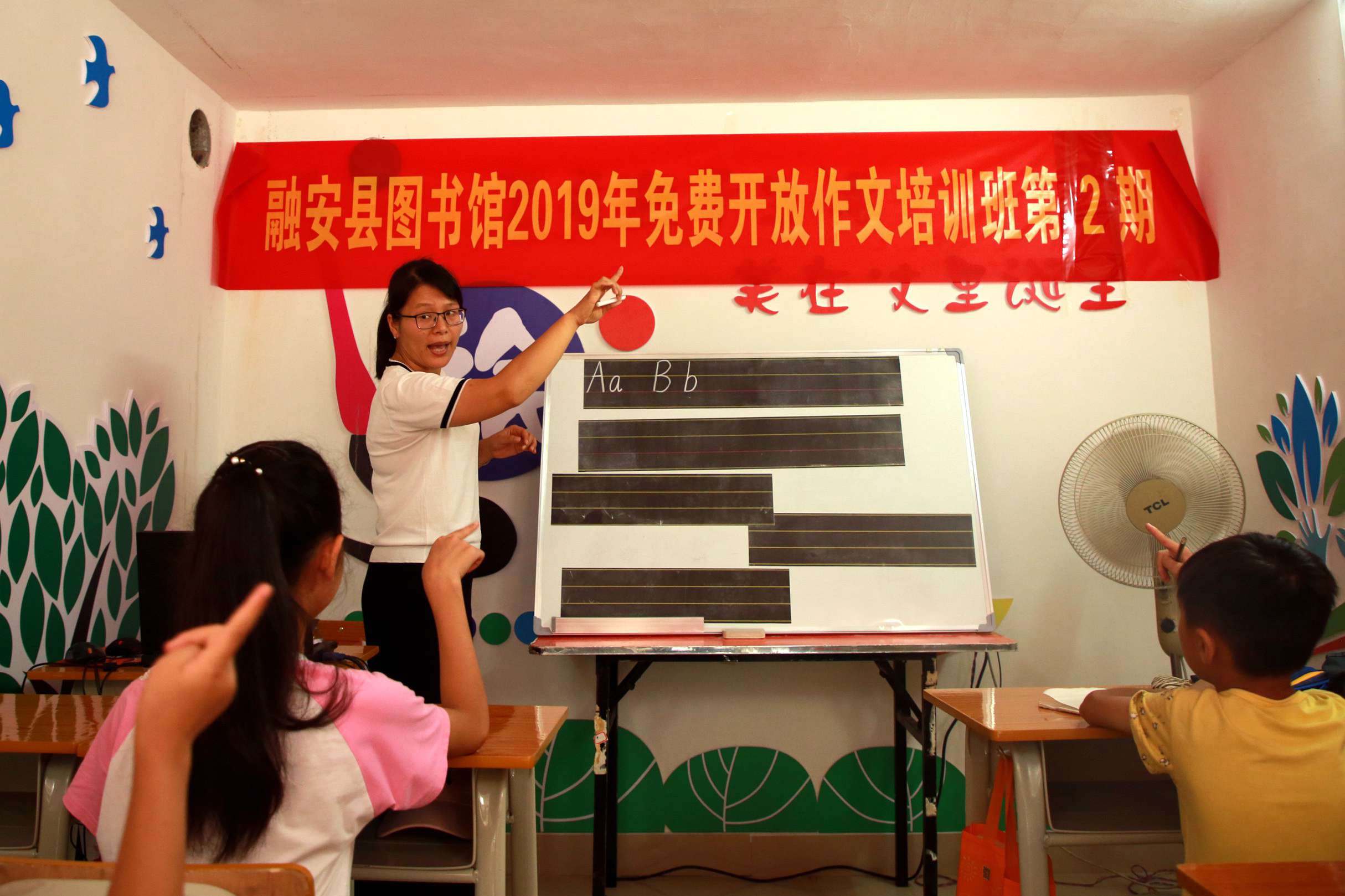 图1为:7月23日,在融安县易地扶贫移民新区融康社区,贫困户的孩子们正在暑假公益班里快乐学习英语。(卫纲 摄)