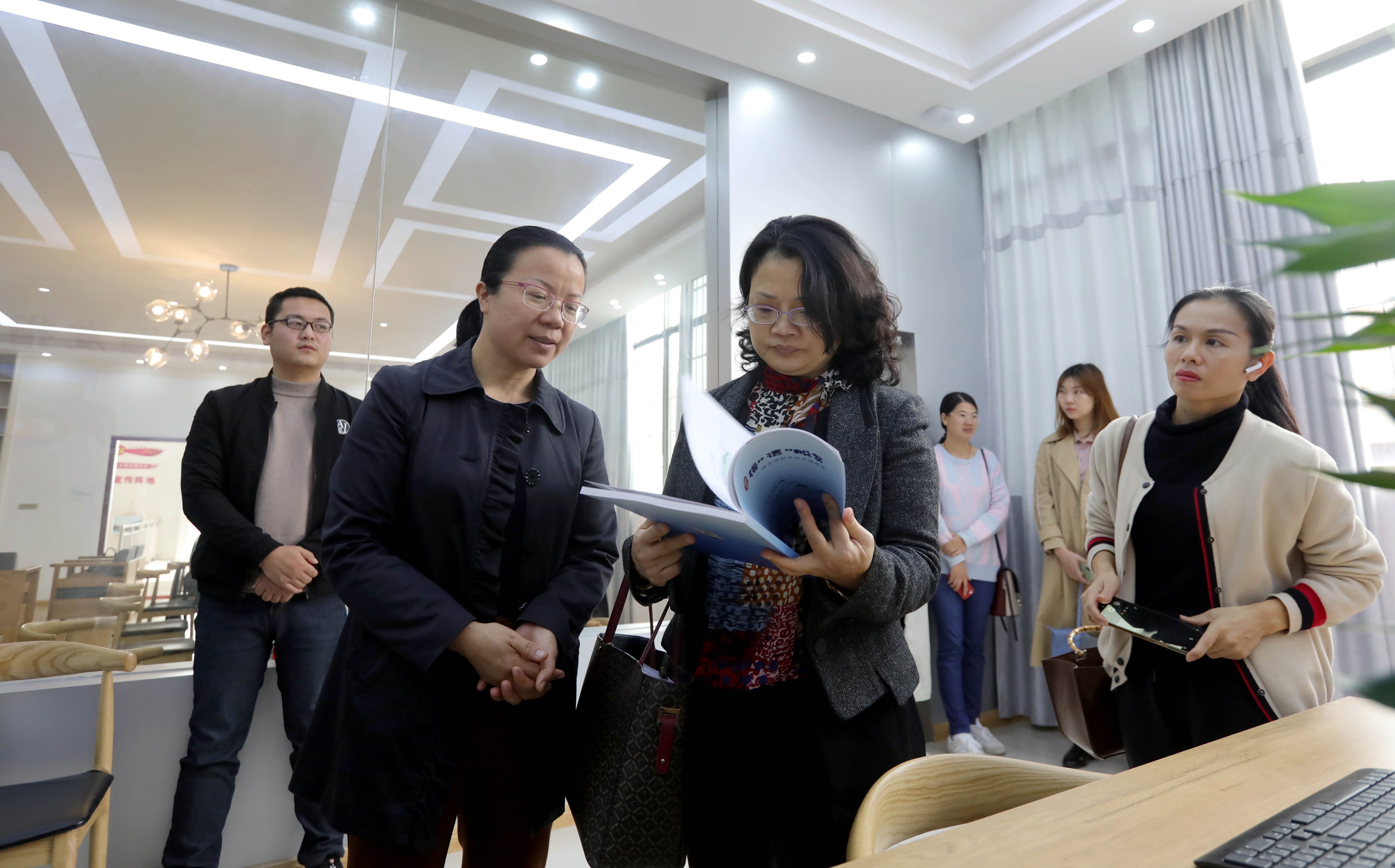 柳州市网信办主任韦晓玲(前左二)参观融安县融媒体中心建设情况,并查看融安县脱贫攻坚影像资料。