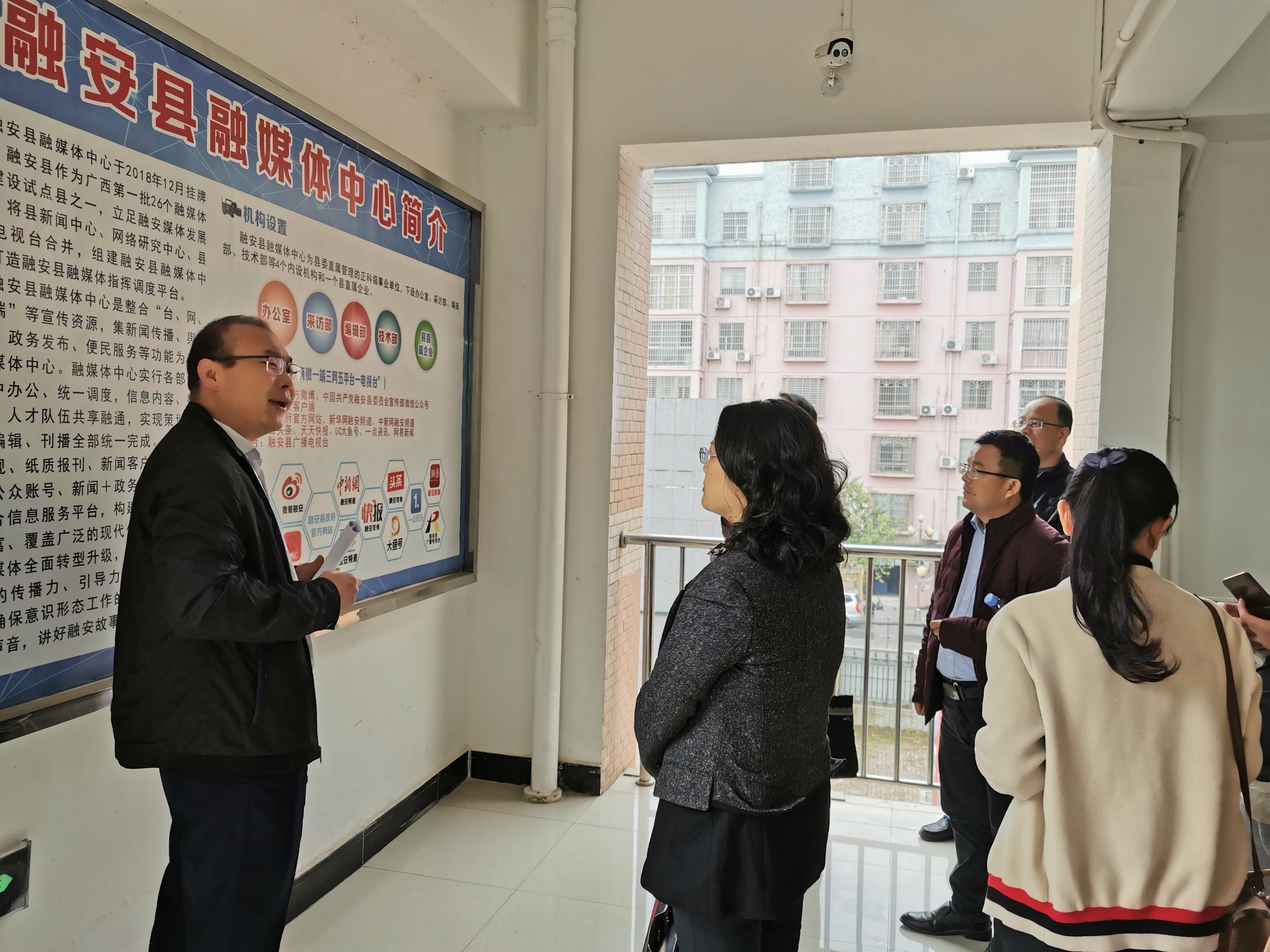 融安县委宣传部副部长谭克兴(左一)在向参会人员介绍该县融媒体平台建设情况。