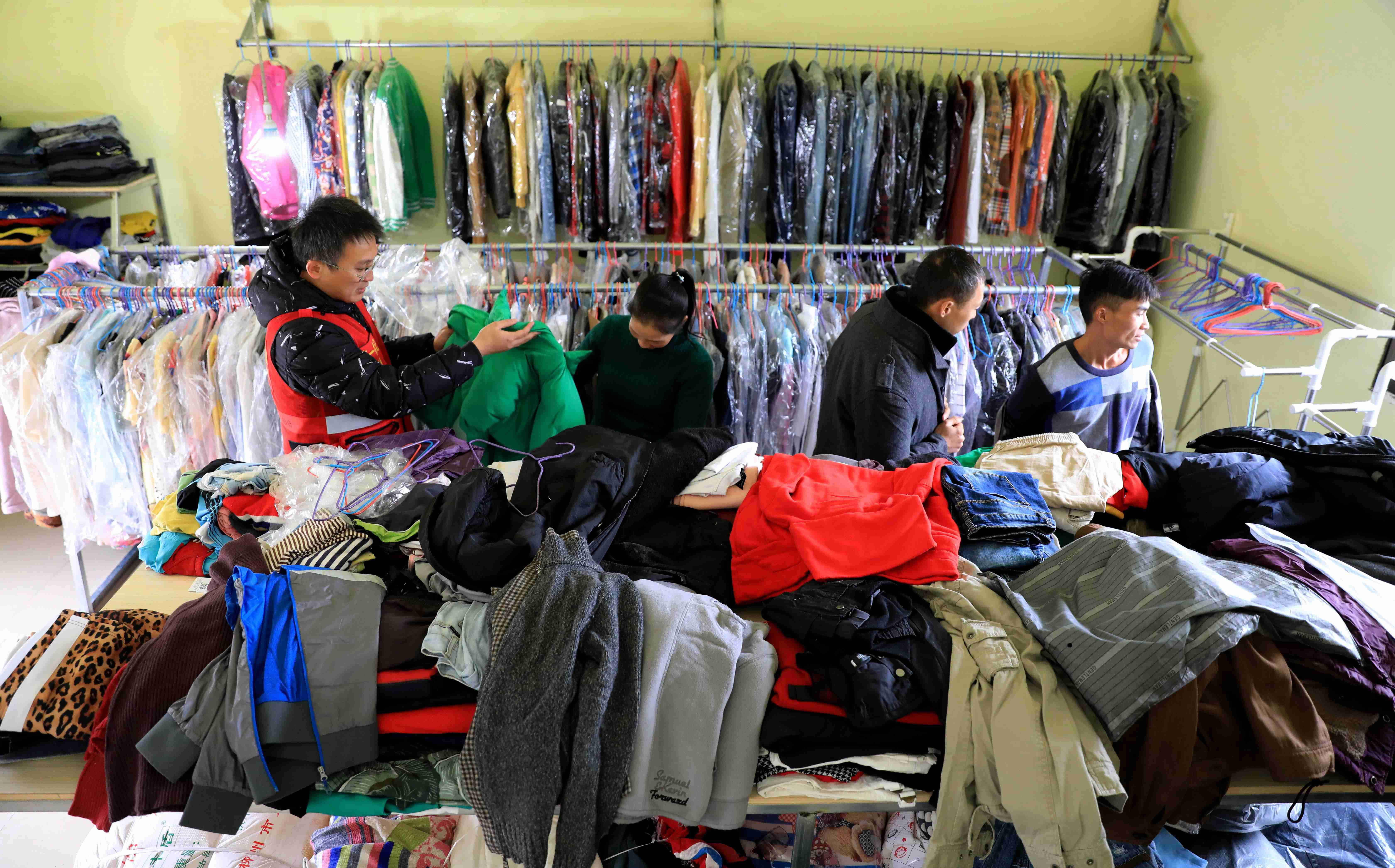 11月26日,在融安县桥板乡古丹村村委捐赠室,驻村第一书记文敏捷(左一)与当地群众在免费挑选冬衣。(覃庆和 摄)
