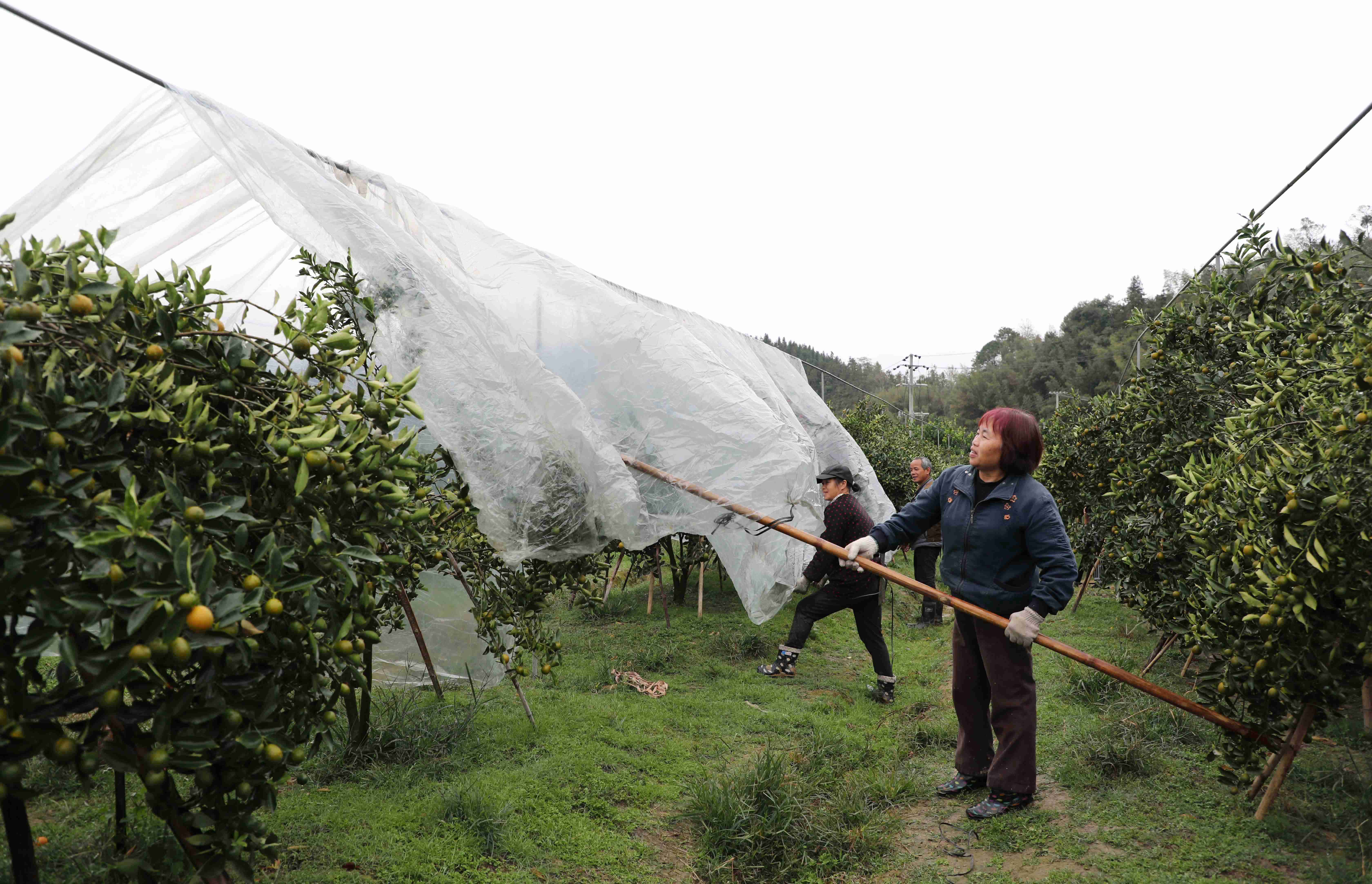 当日,在融安县大将镇合理村金桔种植园里,果农们拿着塑料薄膜将一棵棵长满金桔的果树覆盖起来,给即将成熟的金桔撑起一把保护伞,田间地头一派繁忙的景象。