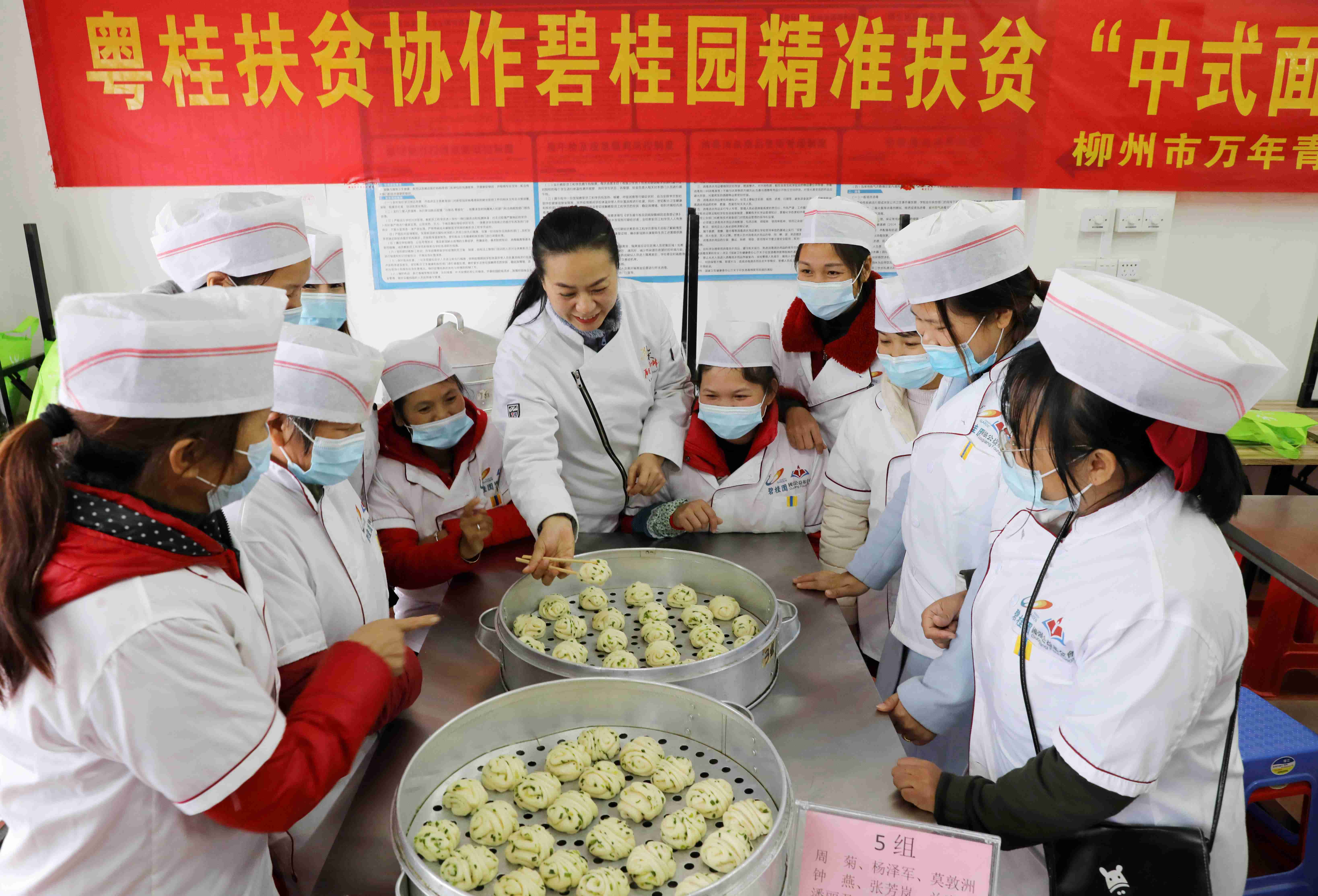 11月25日,在融安县融康社区职业技术培训中心,社区群众正在免费接受 “花卷”制作知识培训。(韦荣军 摄)