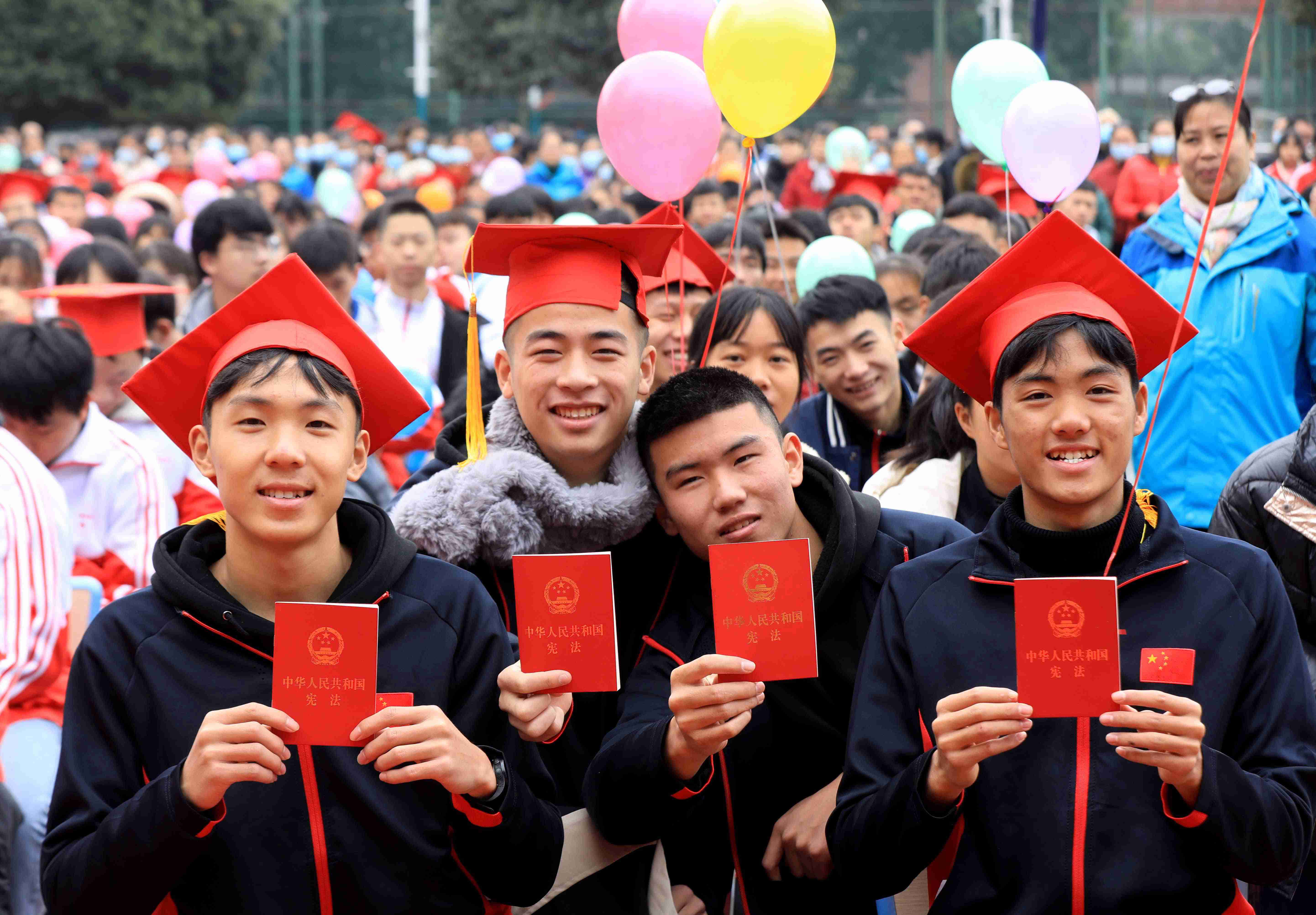 11月30日,在融安县第二中学,青年学生展示领取到的《中华人民共和国宪法》读本。当日,广西柳州市融安县第二中学举行2020年高三学生“成人仪式”,学校为参加“成人仪式”的青年学生每人赠送一本《中华人民共和国宪法》读本,教育和引导学生学法、守法、用法、护法,做一名遵纪守法的好青年,进一步提高学生的法律意识和法制观念,有效地预防和减少在校学生违法犯罪行为,争做一名对国家、对社会有用的人。