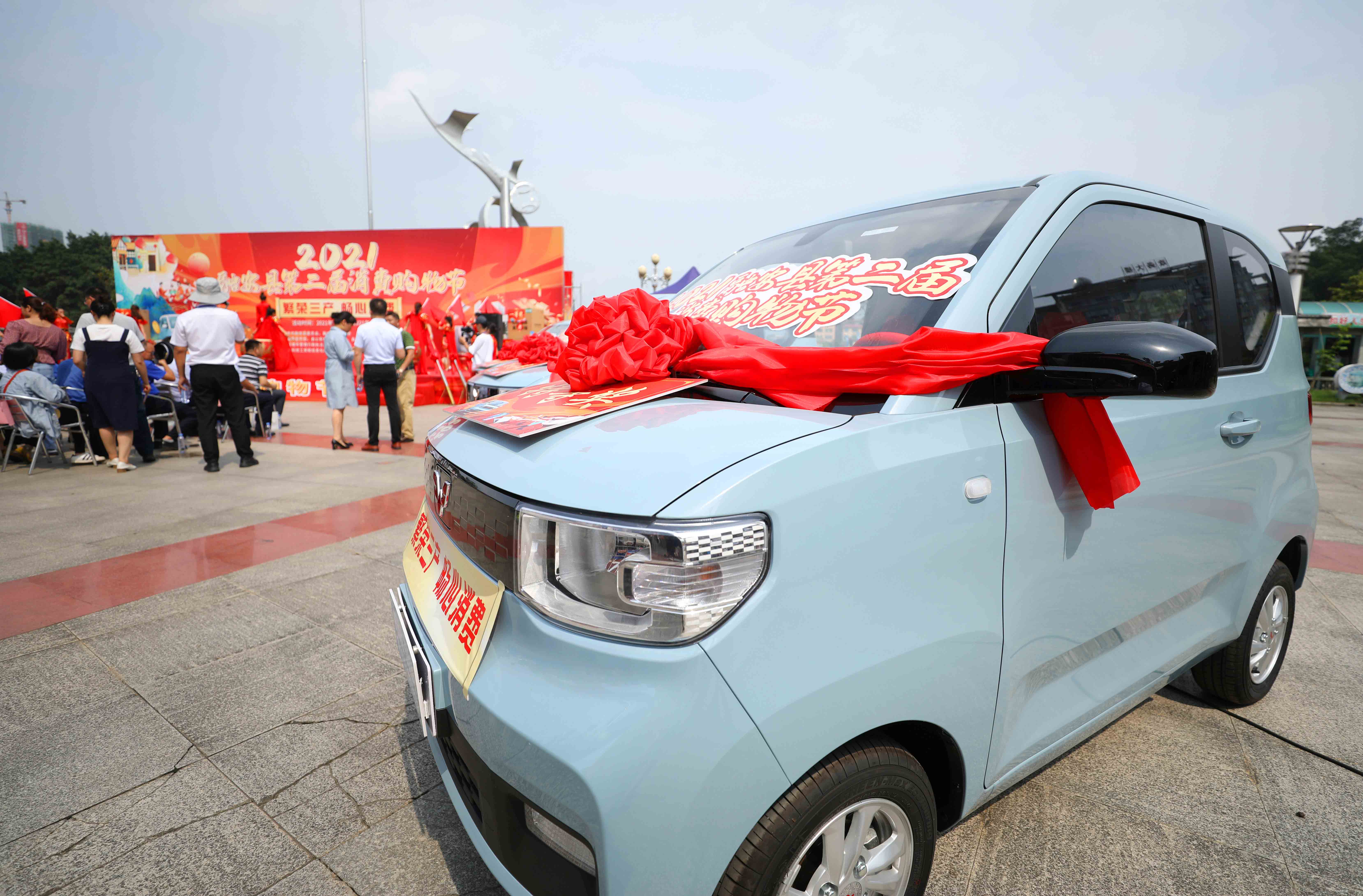 7月6日,在广西柳州市融安县长安广场拍摄的2021融安县第二届消费购物节活动启动仪式现场。