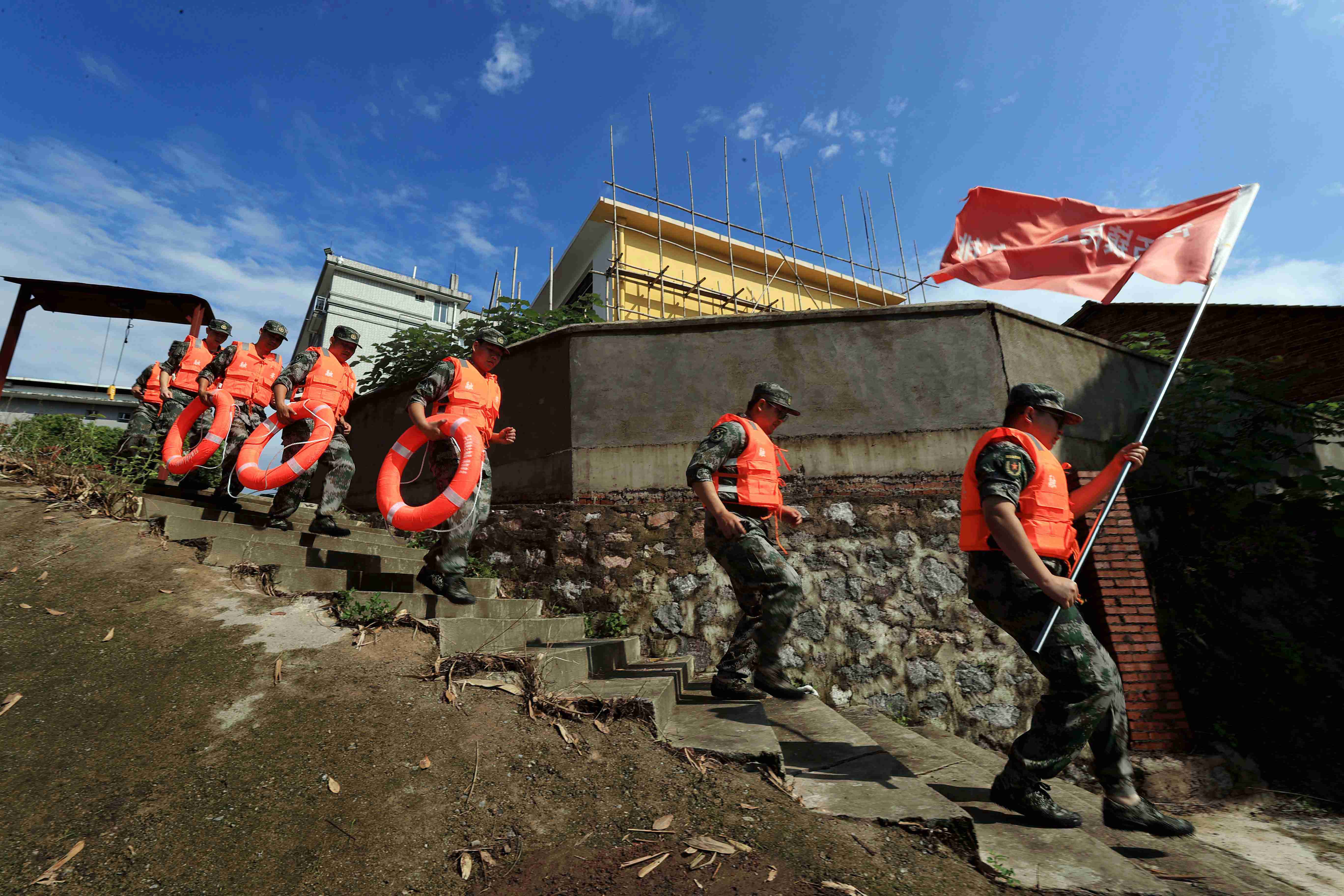 5月10日,在珠江上游融江广西柳州市融安县浮石镇段江面,民兵应急分队在进行冲锋舟操控训练。