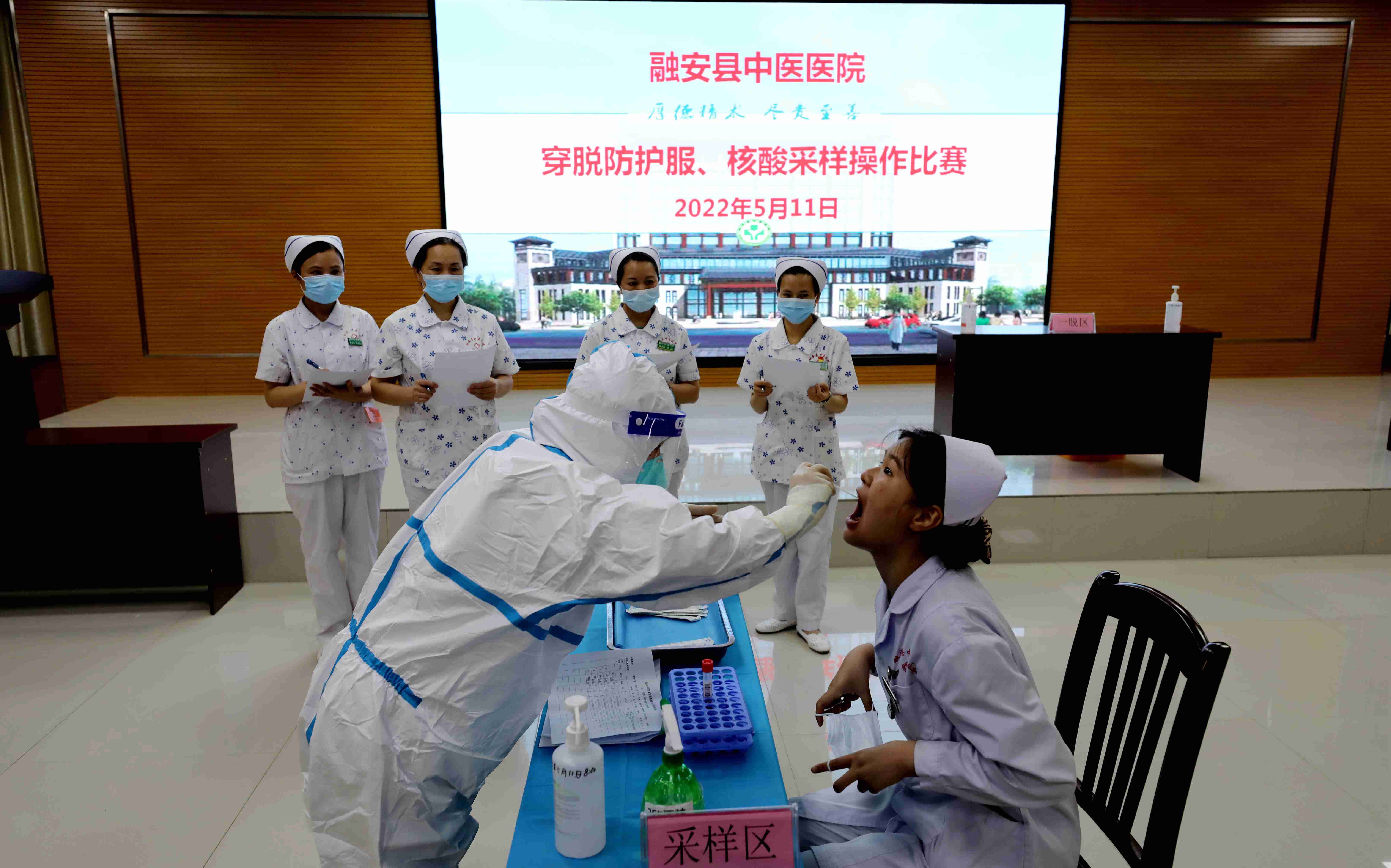 5月11日,在融安县中医医院,医护人员在穿脱防护服、核酸采样操作比赛中。(覃庆和 摄)