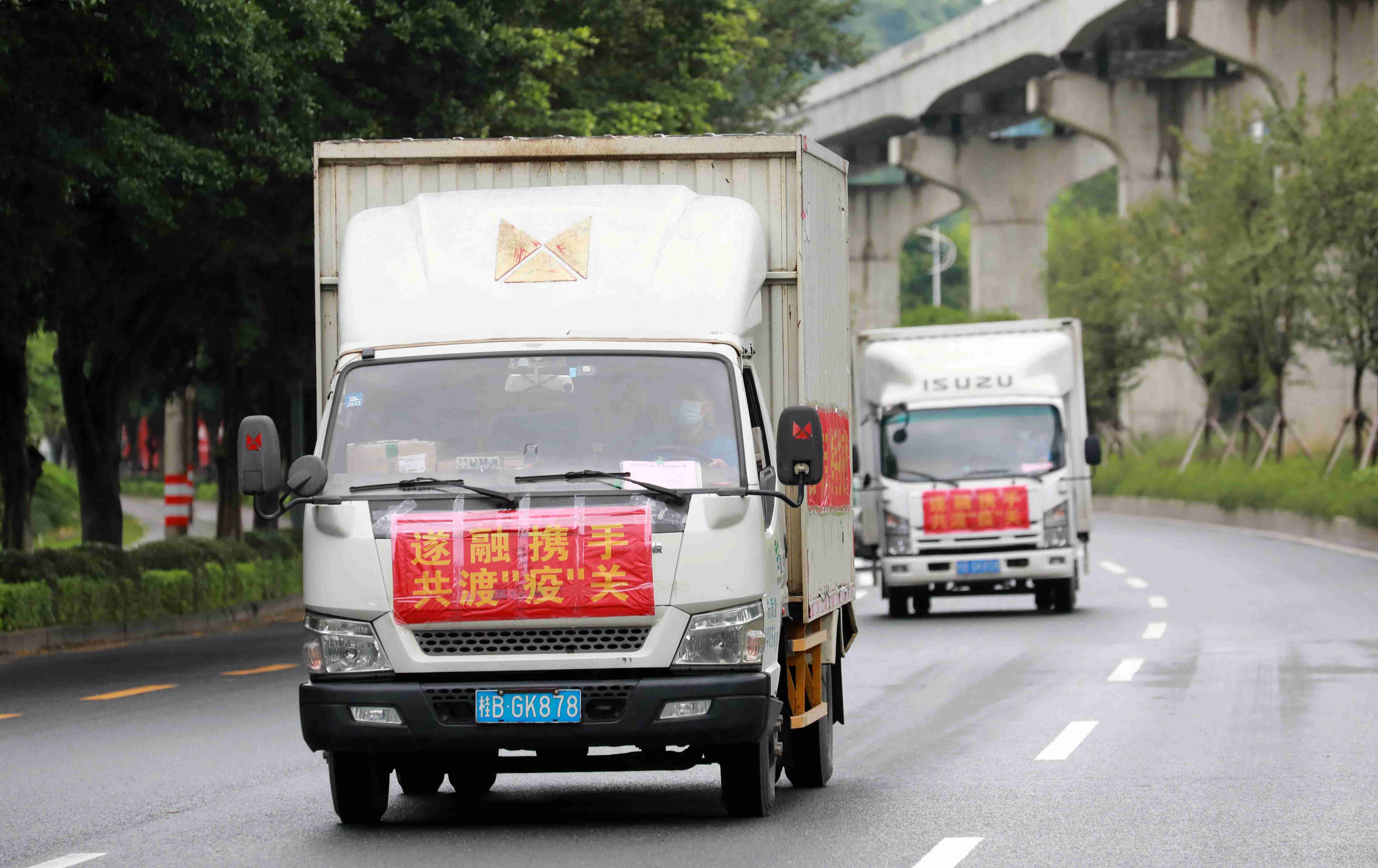 5月12日,两辆运送爱心医疗物资的车辆行驶在广西柳州市柳石路上,准备前往广东省遂溪县。(谭凯兴 摄)