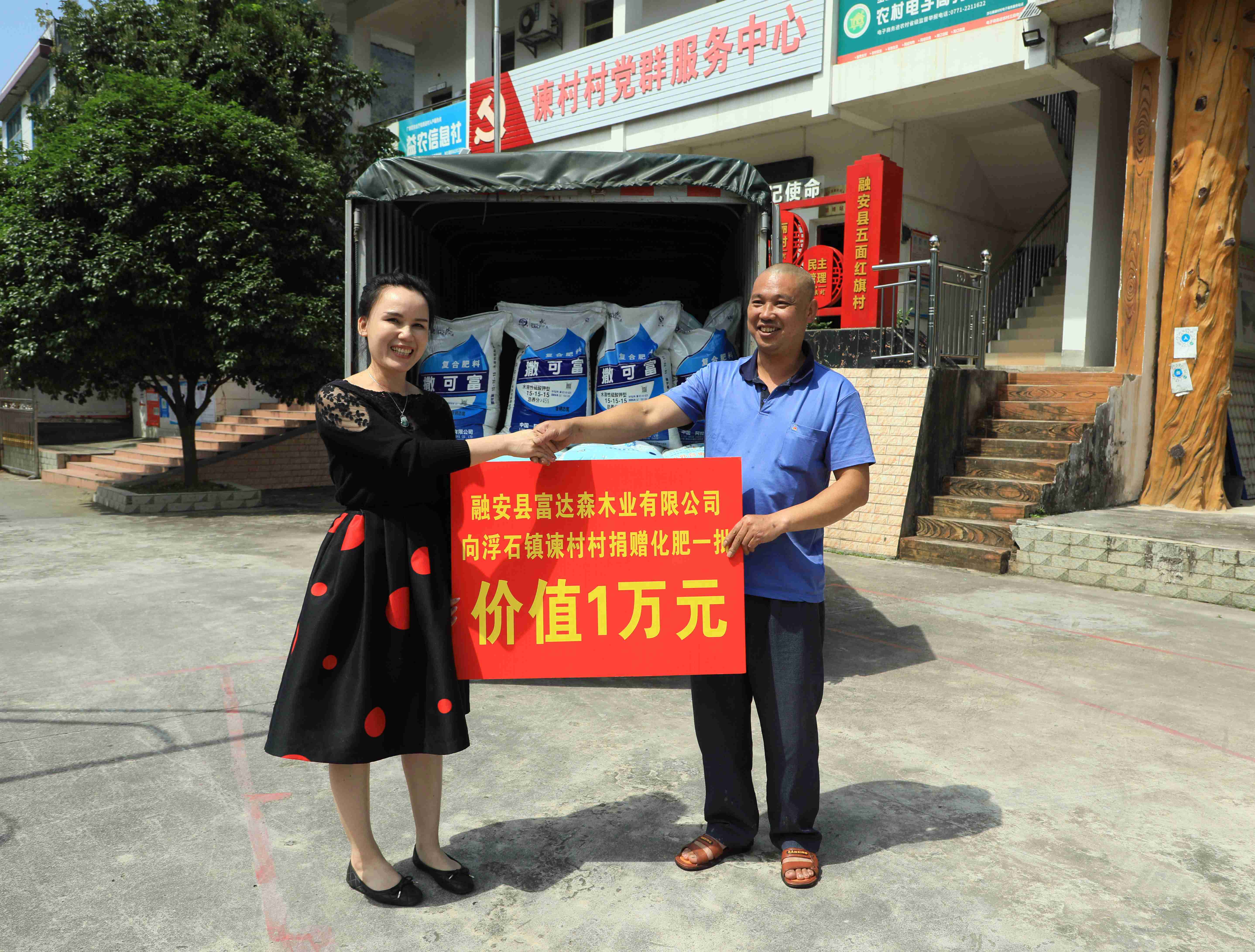 5月17日,融安县富达森木业有限公司向浮石镇谏村村捐赠一批化肥。(韦胜耀 摄)