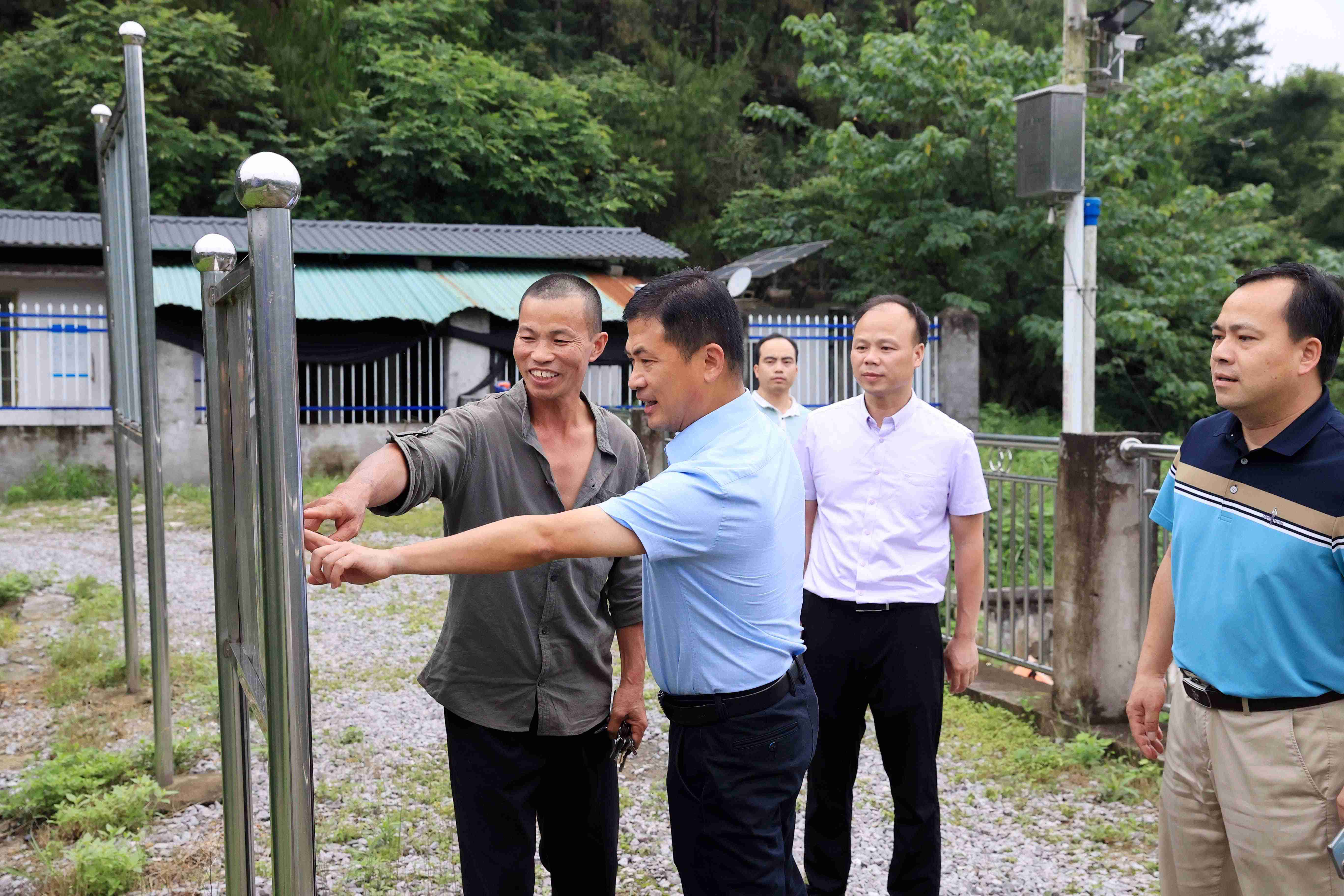 6月3日,在融安县长安镇大岩水库,县委书记陈文敏(左二)在查看水库大坝管理责任人公示牌。(谭凯兴 摄)