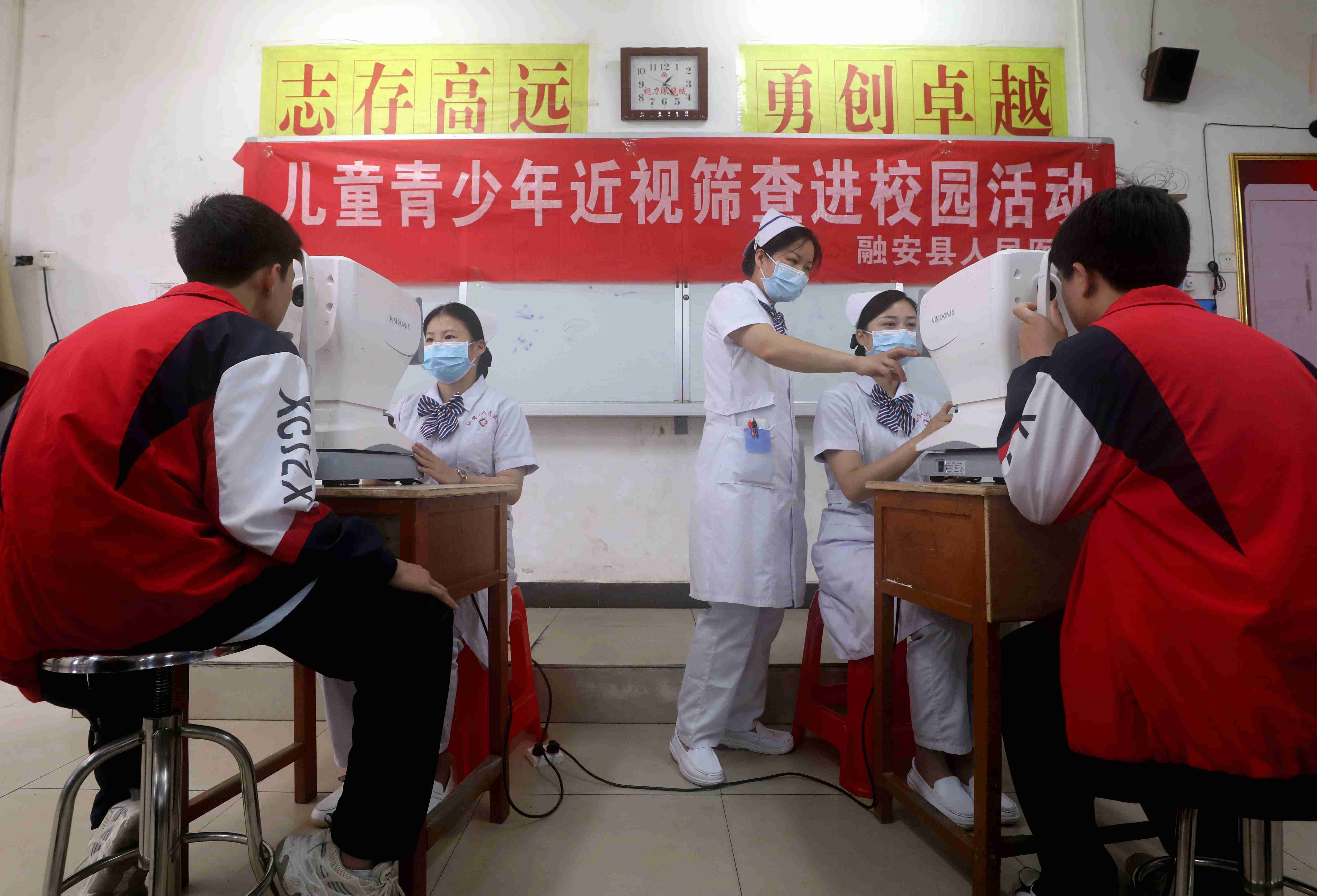 6月6日,在融安县初级中学,医务人员正在为中学生进行低视力筛查。(韦荣军 摄)