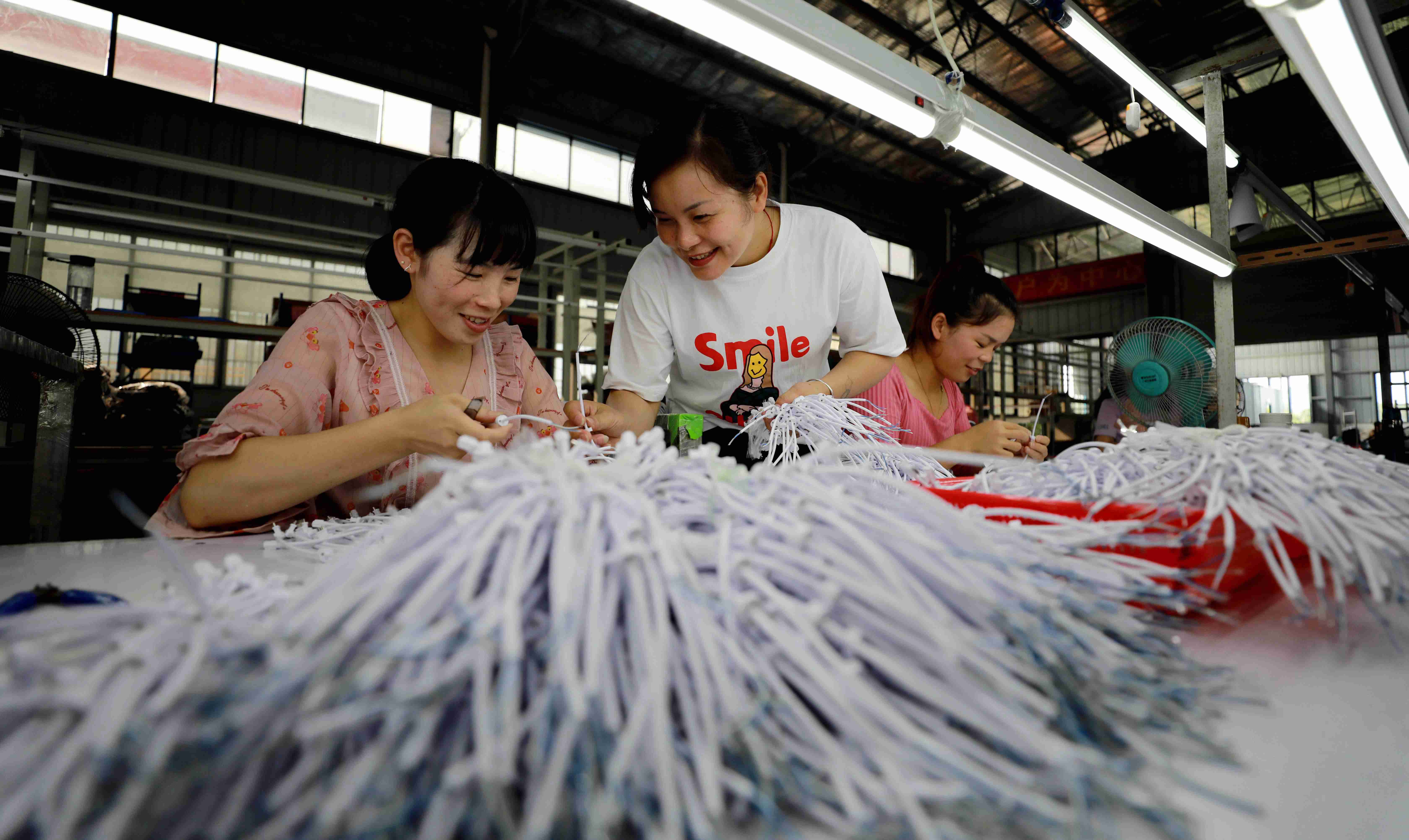 6月9日,在融安县粤桂协作产业园,工人在一家专门生产手机数据线、电脑周边线、汽车车载线的电子厂车间劳作。