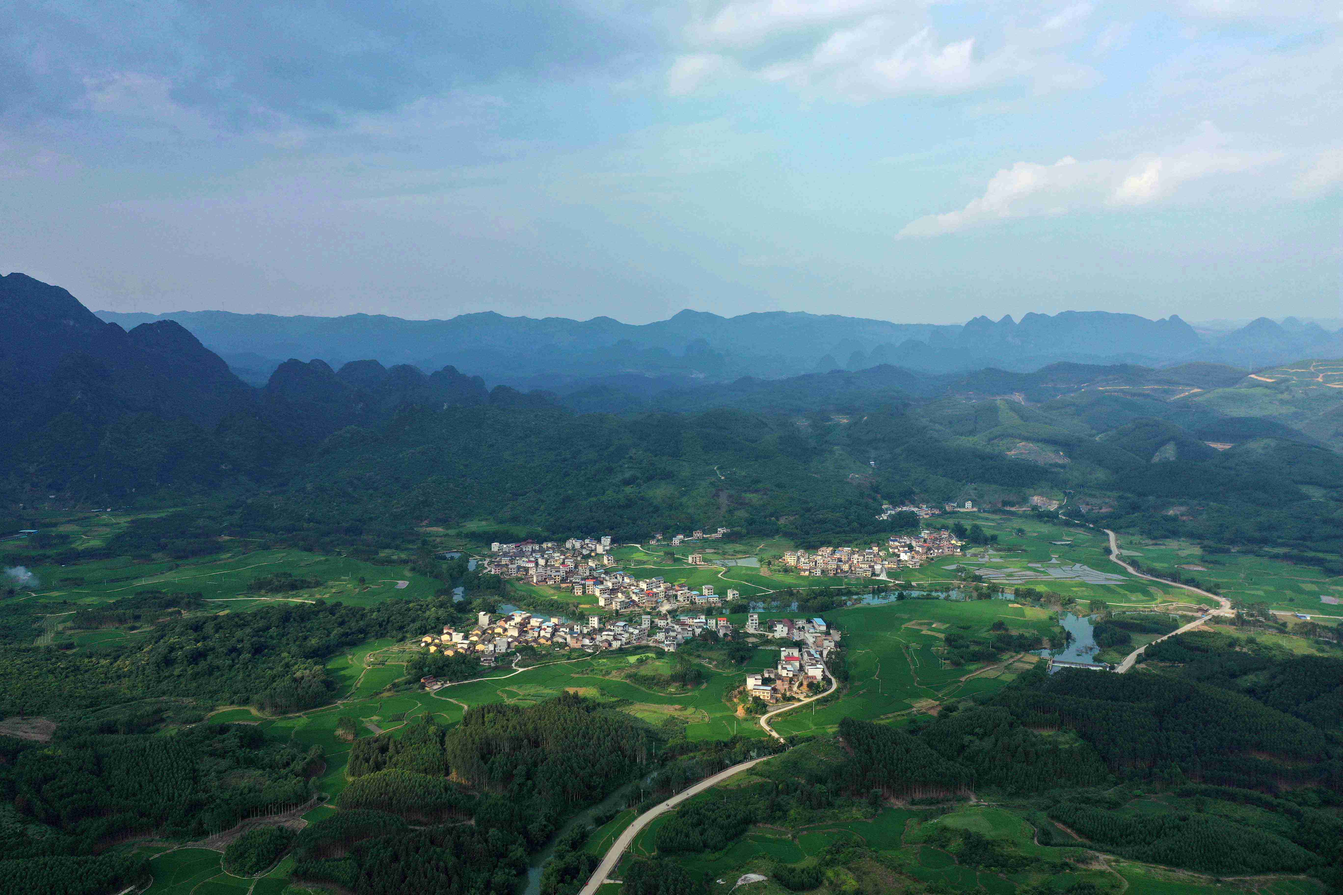 6月8日,在融安县大良镇新和村拍摄的田园美景。仲夏时节,地处桂北的柳州市融安县田野里水稻泛绿,溪水清清,绿色的田园和古朴的壮族村寨相互映衬,构成一幅“看得见山、望得见水、记得住乡愁”充满诗意的山水田园画卷。