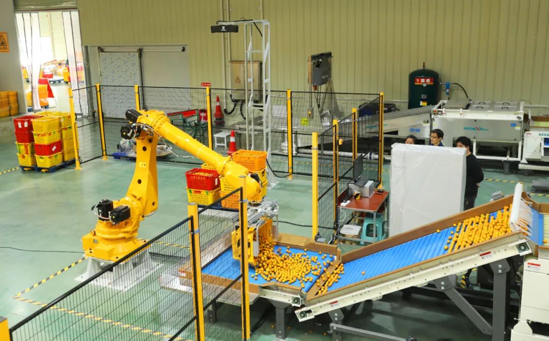 作为融安金桔产业的龙头企业,广西融安桔乡里农业有限公司率先破局,在原有的金桔无损测糖分选线的基础上,新引进智能自动机械臂、AI自动化搬运叉车、全自动打包封箱流水线等一批先进设备,构建起数字化产地仓运营体系。
