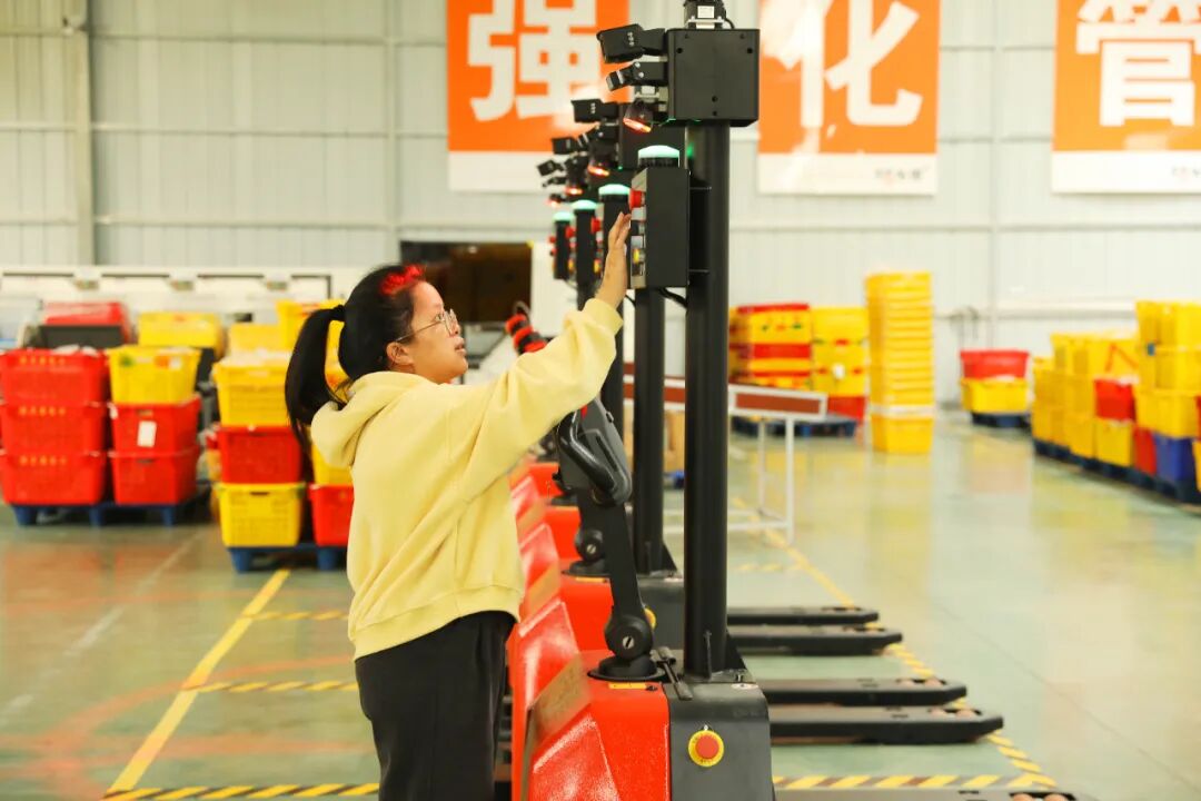 11月25日,在广西融安桔乡里农业有限公司,工作人员正在启动AI自动化搬运叉车。(杨曼 摄)