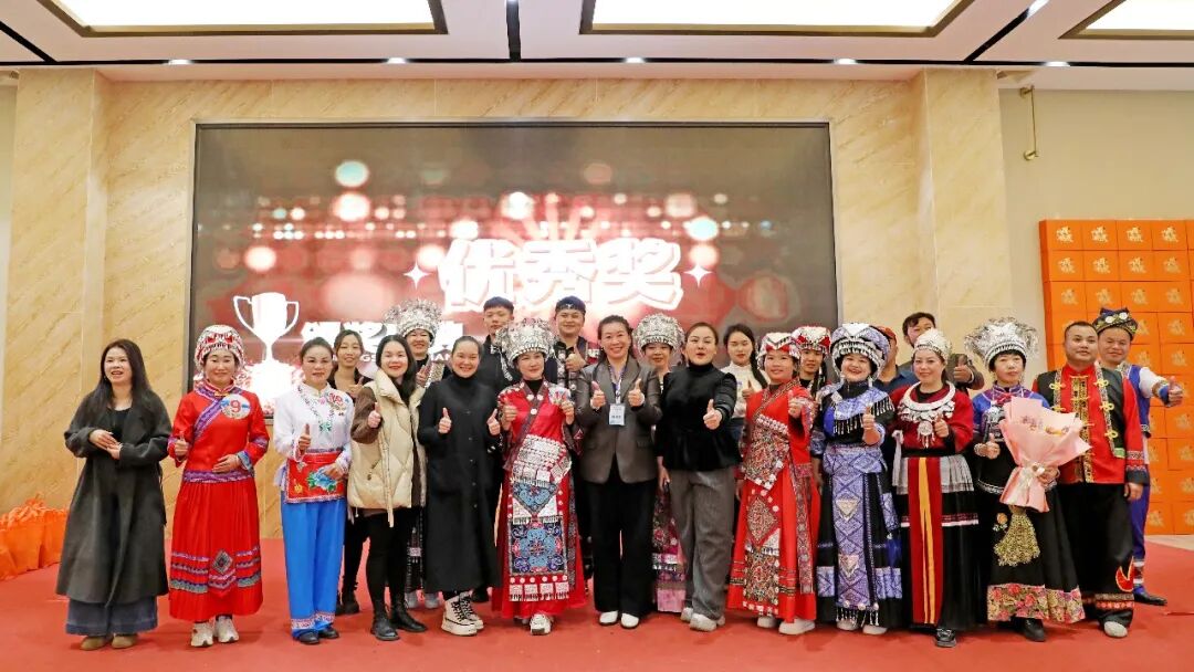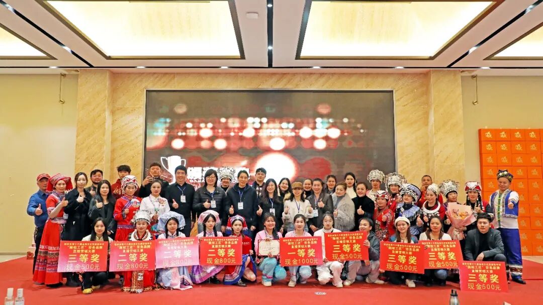 12月17日,在融安县第十六届金桔文化旅游嘉年华系列活动之“融桔工匠”劳务品牌技能大赛现场,获得一等奖的参赛选手合影。(邓西妮 摄)