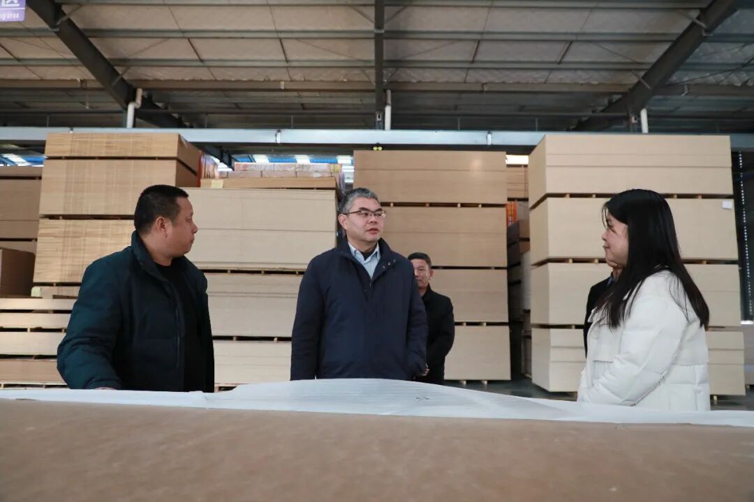 1月7日,县委书记于福坚(左二)到融安县鑫利达木业有限公司调研。(方淑敏 摄)