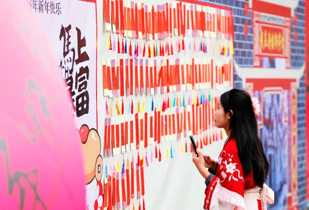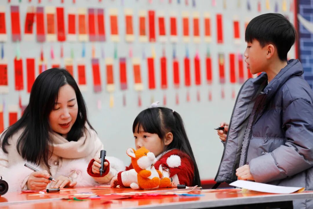 活动深度融合本地非遗与年俗,设置互动体验、市集展销、民俗游乐等多个板块,现场年味浓郁、人气高涨。在非遗工坊·年味互动区,市民们运用长安纸匠技艺扎制鱼灯,寄托新春祈愿;在非遗市集·年味好物区,游客可以品尝到长安滤粉、融安米糕、融安烧炙等特色小吃,感受地道的传统风味。文明祈福墙上,贴满承载新年愿望的非遗纹样信纸,文明过节、勤俭节约等新风尚悄然传递。